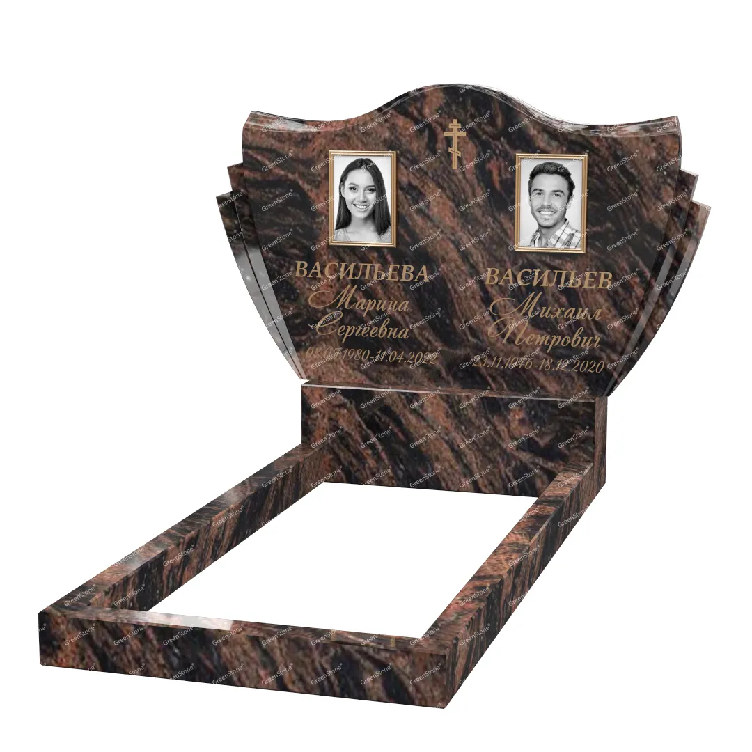 Типовой размер стелы двойного памятника составляет 60×100×5см., однако мы готовы изготовить его в соответствии с любым размером по желанию Заказчика. Цветовое исполнение также не ограничивается традиционным черным цветом. Это может быть гранит Indian Aurora (Индия), как в данном исполнении, или любой другой из более чем 20 сортов гранита, который вызовет у Вас только самые положительные эмоции.