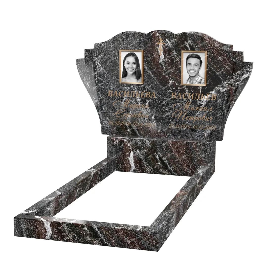Типовой размер стелы двойного памятника составляет 60×100×5см., однако мы готовы изготовить его в соответствии с любым размером по желанию Заказчика. Цветовое исполнение также не ограничивается традиционным черным цветом. Это может быть гранит Гранатовый амфиболит (Россия), как в данном исполнении, или любой другой из более чем 20 сортов гранита, который вызовет у Вас только самые положительные эмоции.