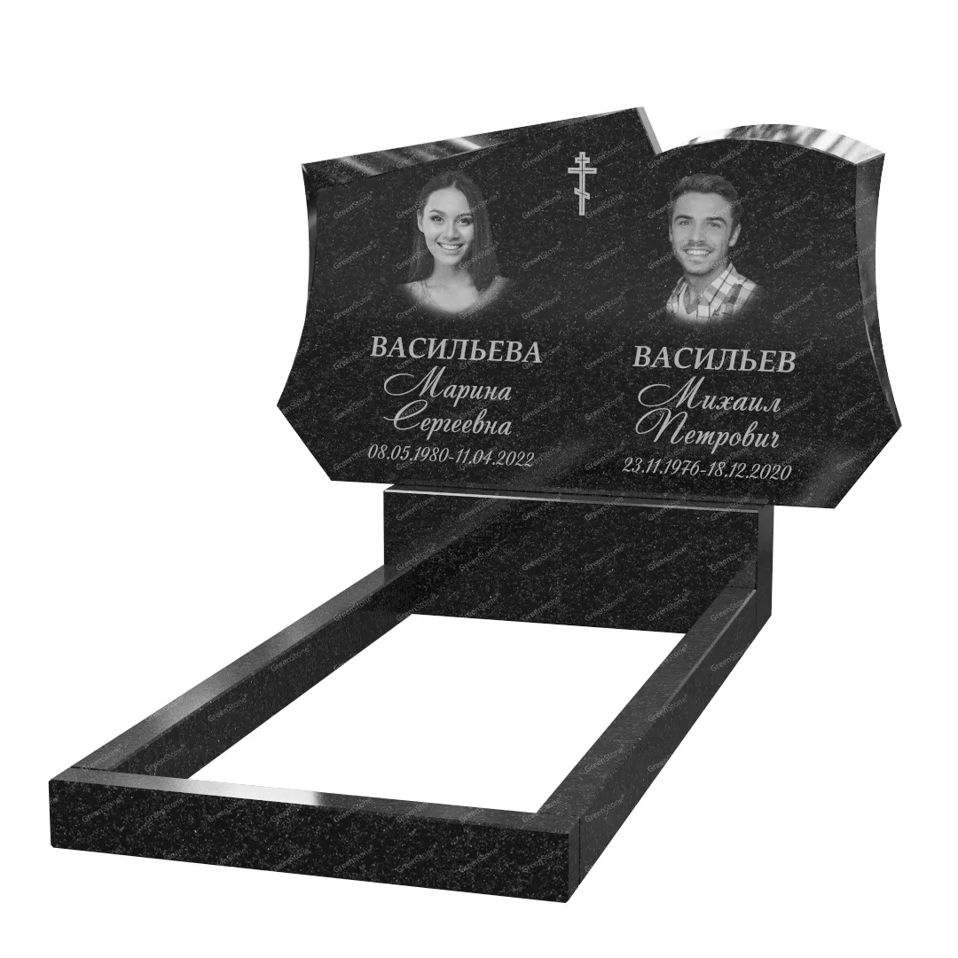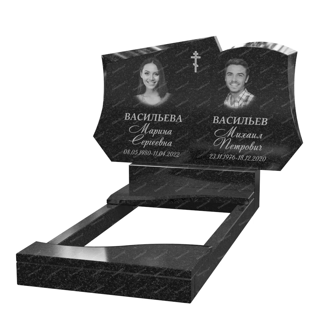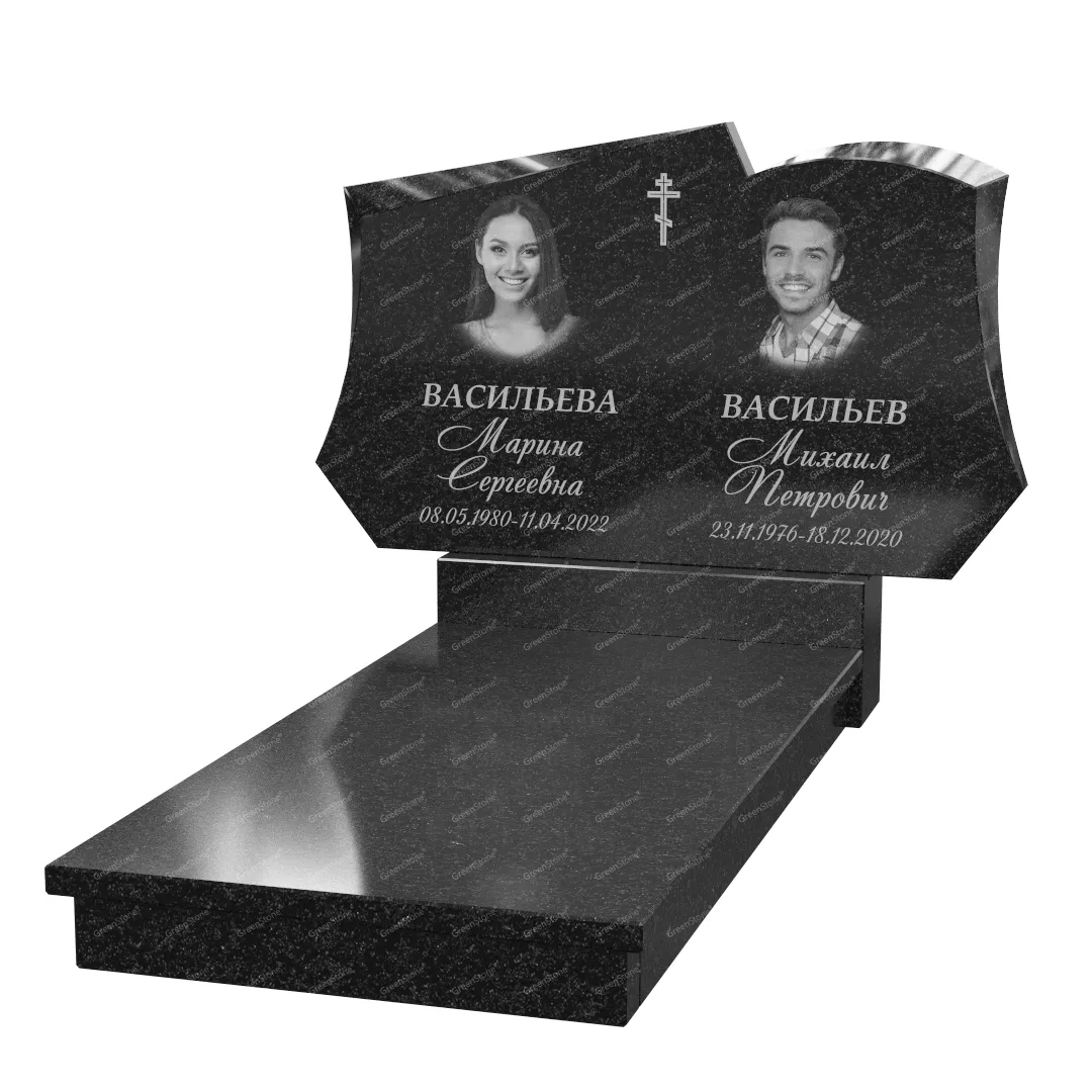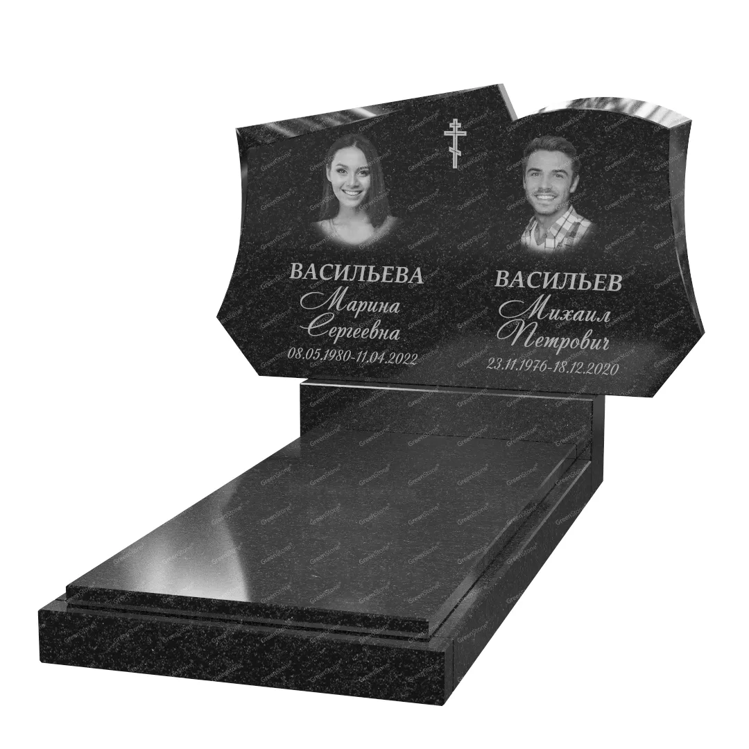 Типовой размер стелы двойного памятника составляет 60×100×5см., однако мы готовы изготовить его в соответствии с любым размером по желанию Заказчика. Цветовое исполнение также не ограничивается традиционным черным цветом. Это может быть гранит Габбро-диабаз (Россия), как в данном исполнении, или любой другой из более чем 20 сортов гранита, который вызовет у Вас только самые положительные эмоции.