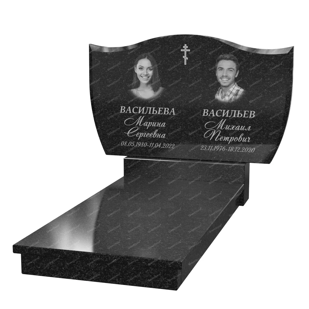 Типовой размер стелы двойного памятника составляет 60×100×5см., однако мы готовы изготовить его в соответствии с любым размером по желанию Заказчика. Цветовое исполнение также не ограничивается традиционным черным цветом. Это может быть гранит Габбро-диабаз (Россия), как в данном исполнении, или любой другой из более чем 20 сортов гранита, который вызовет у Вас только самые положительные эмоции.