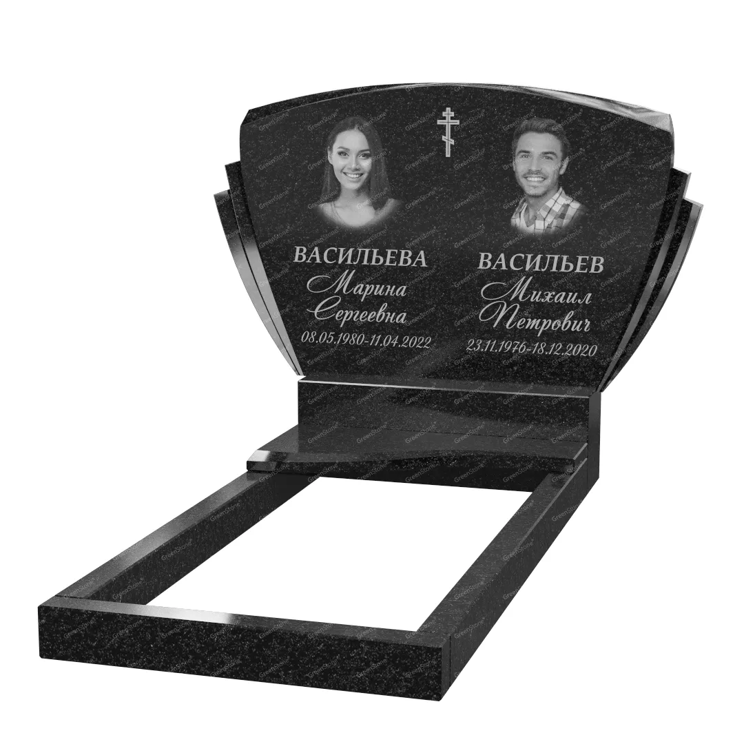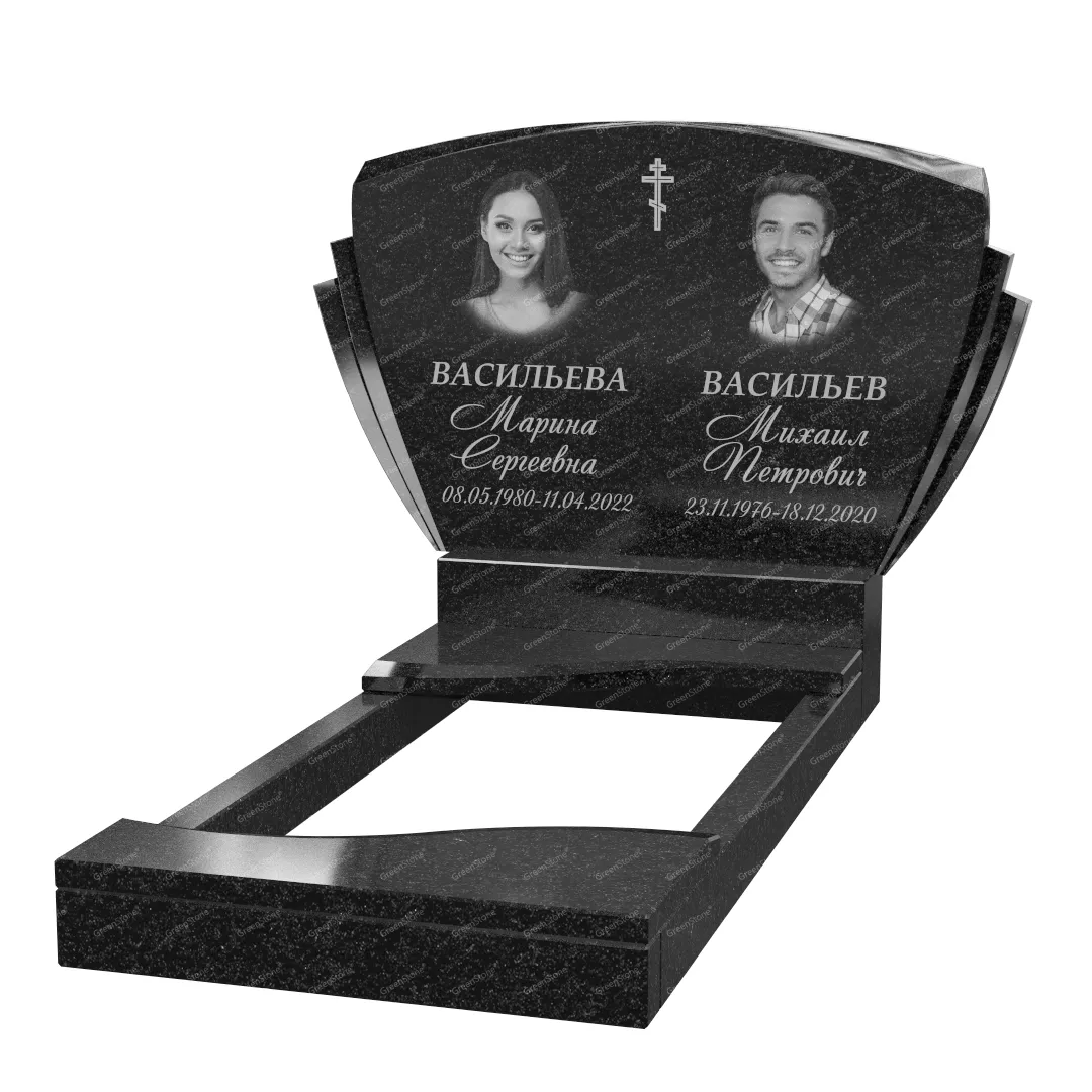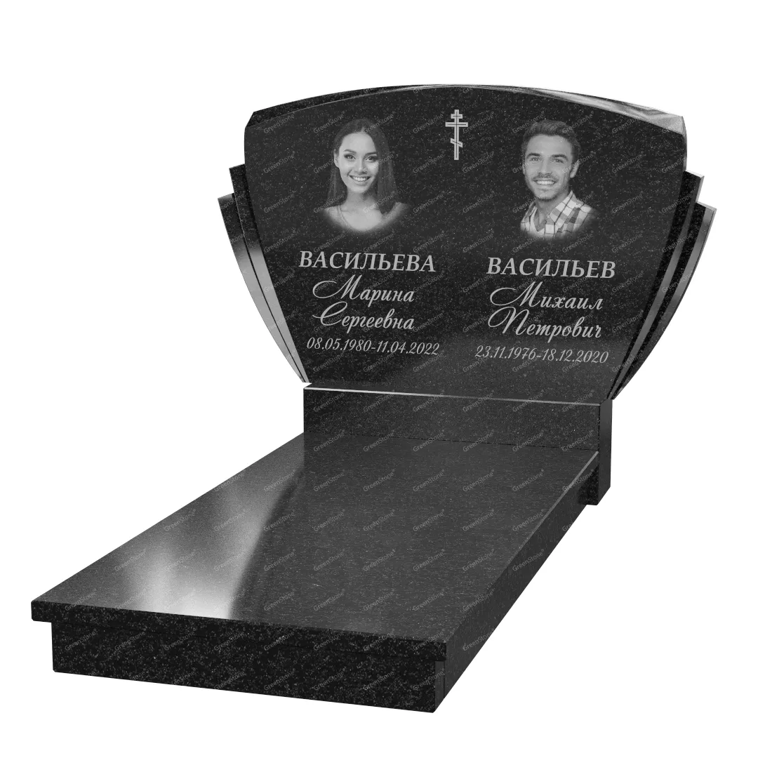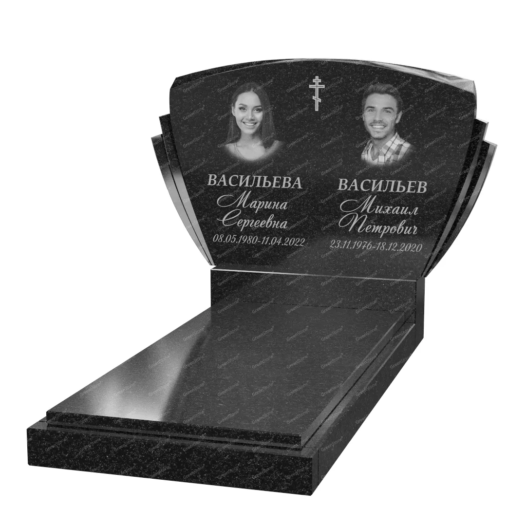 Типовой размер стелы двойного памятника составляет 60×100×5см., однако мы готовы изготовить его в соответствии с любым размером по желанию Заказчика. Цветовое исполнение также не ограничивается традиционным черным цветом. Это может быть гранит Габбро-диабаз (Россия), как в данном исполнении, или любой другой из более чем 20 сортов гранита, который вызовет у Вас только самые положительные эмоции.