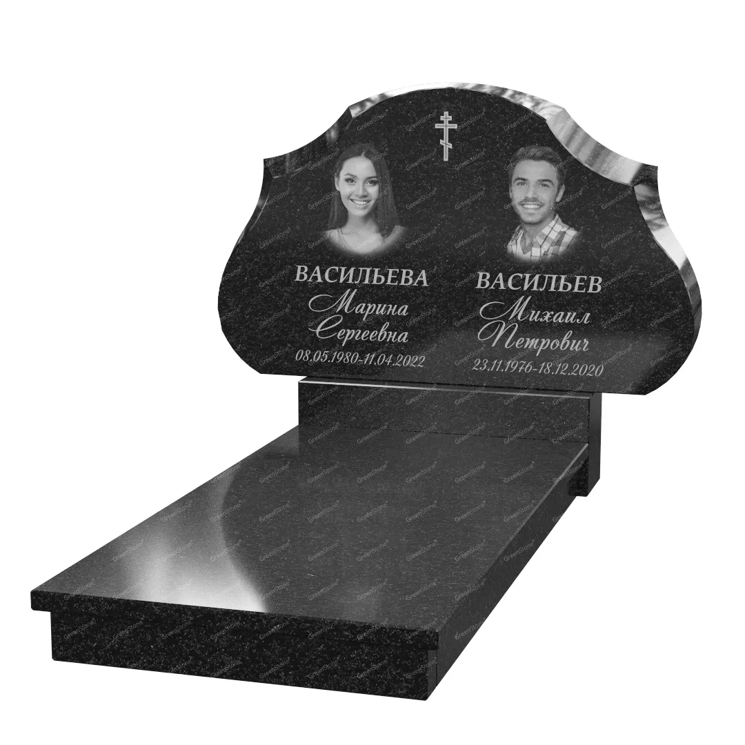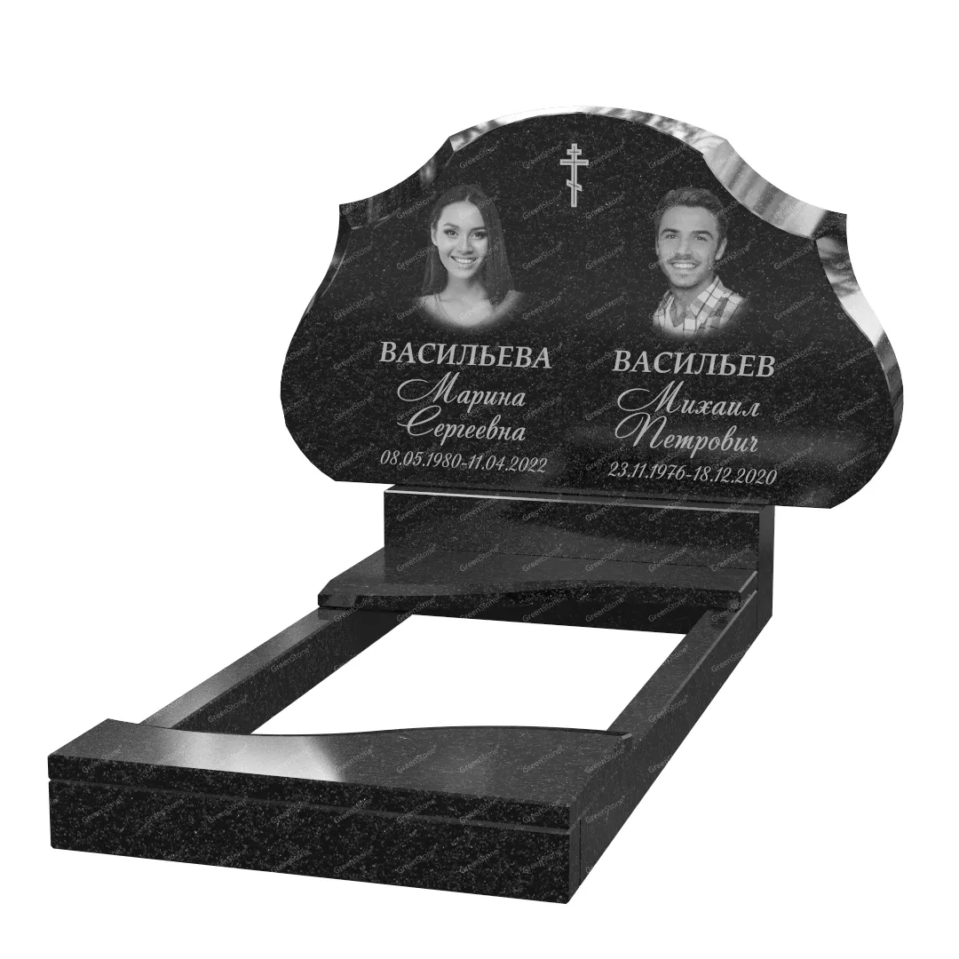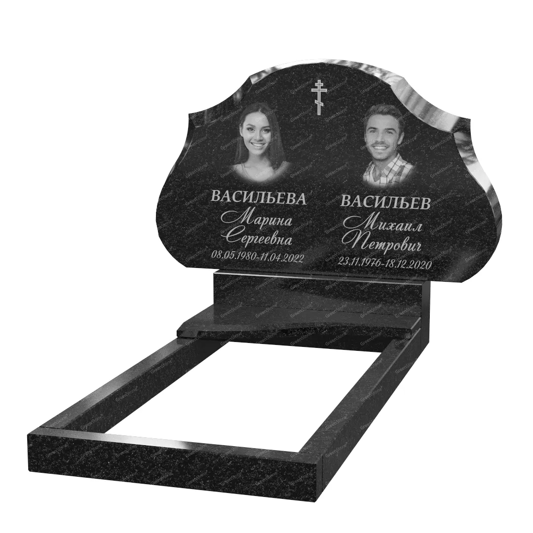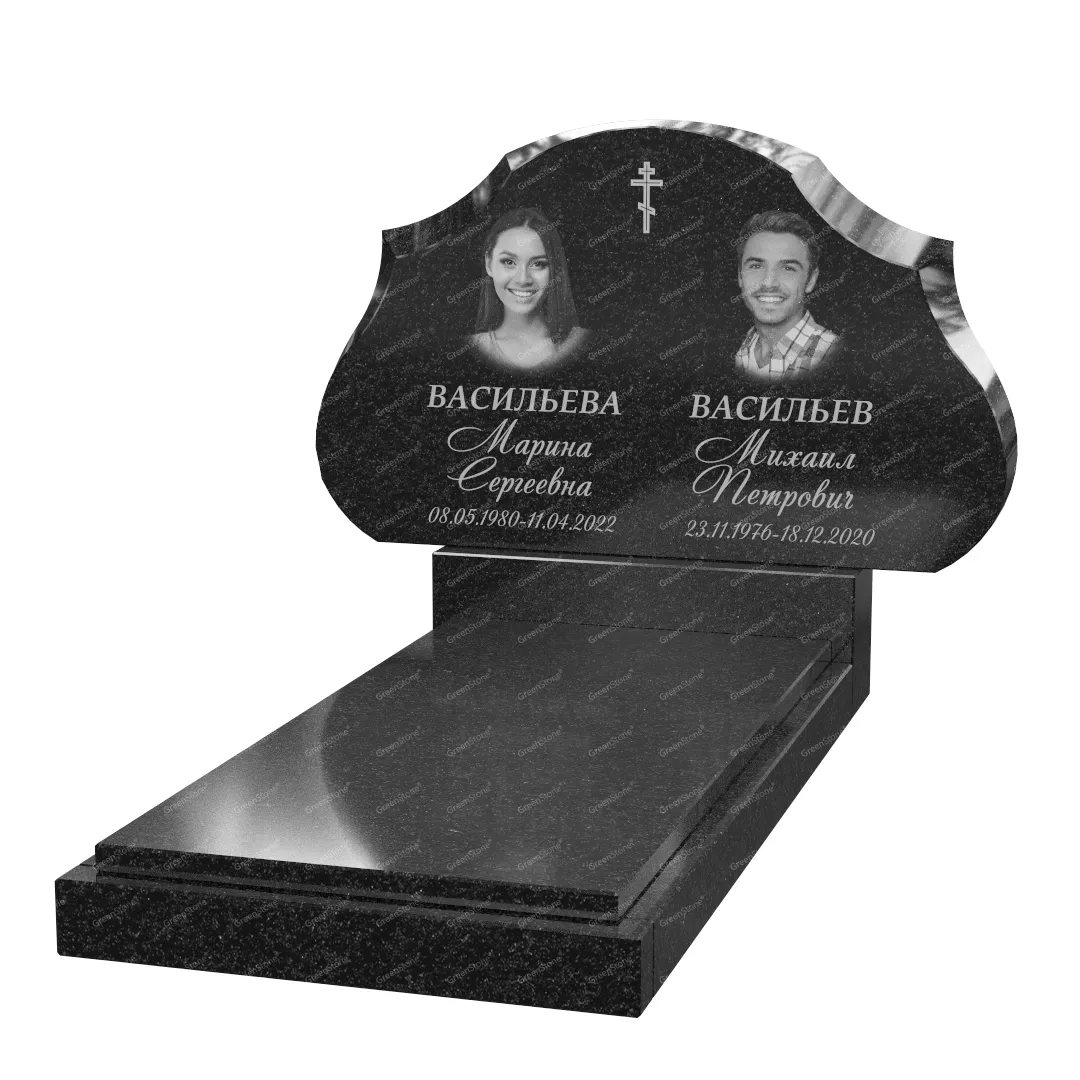 Типовой размер стелы двойного памятника составляет 60×100×5см., однако мы готовы изготовить его в соответствии с любым размером по желанию Заказчика. Цветовое исполнение также не ограничивается традиционным черным цветом. Это может быть гранит Габбро-диабаз (Россия), как в данном исполнении, или любой другой из более чем 20 сортов гранита, который вызовет у Вас только самые положительные эмоции.