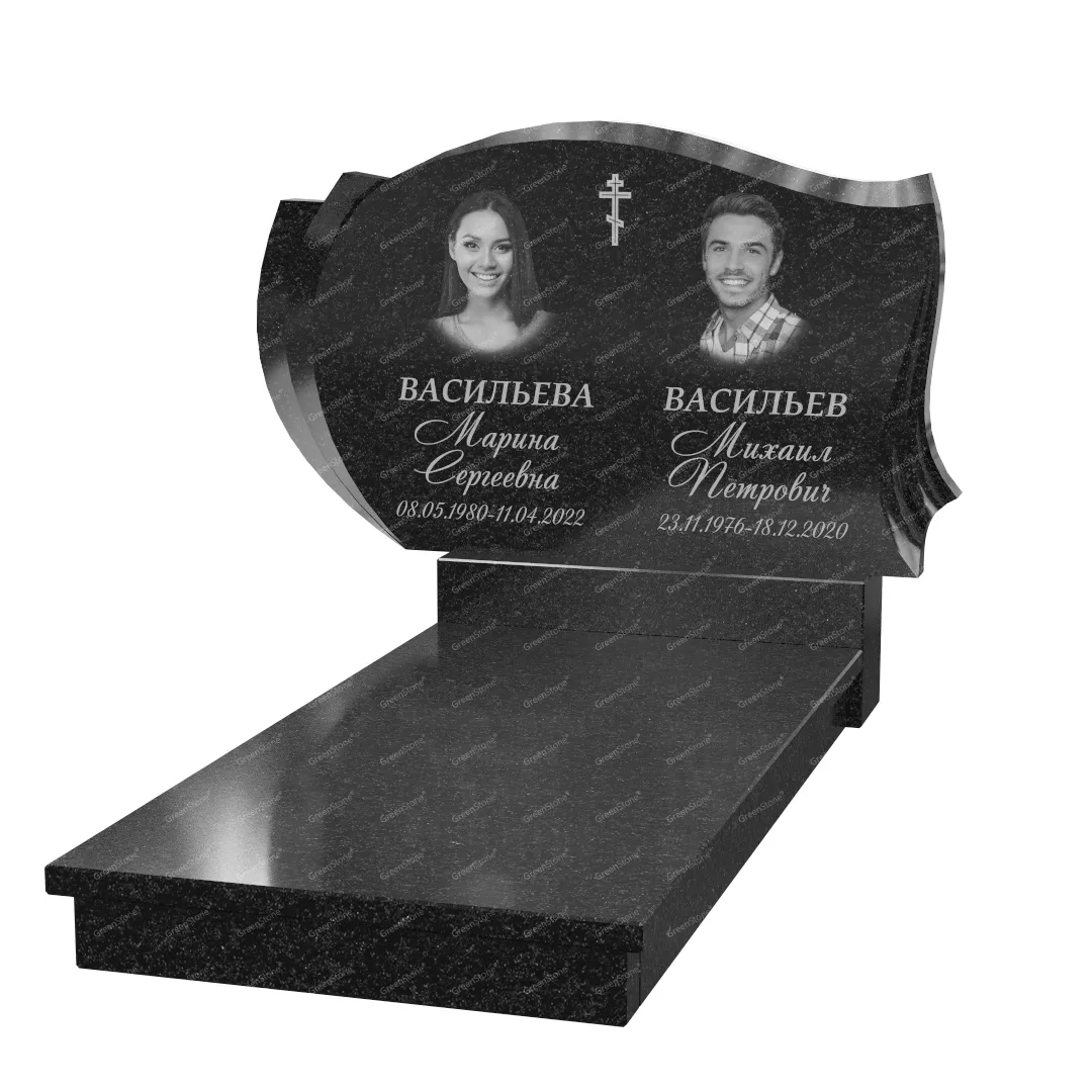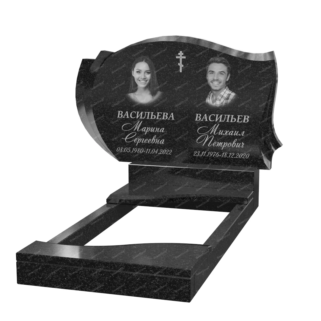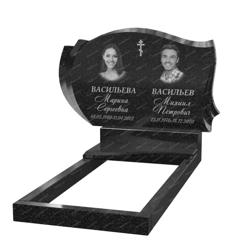 Типовой размер стелы двойного памятника составляет 60×100×5см., однако мы готовы изготовить его в соответствии с любым размером по желанию Заказчика. Цветовое исполнение также не ограничивается традиционным черным цветом. Это может быть гранит Габбро-диабаз (Россия), как в данном исполнении, или любой другой из более чем 20 сортов гранита, который вызовет у Вас только самые положительные эмоции.