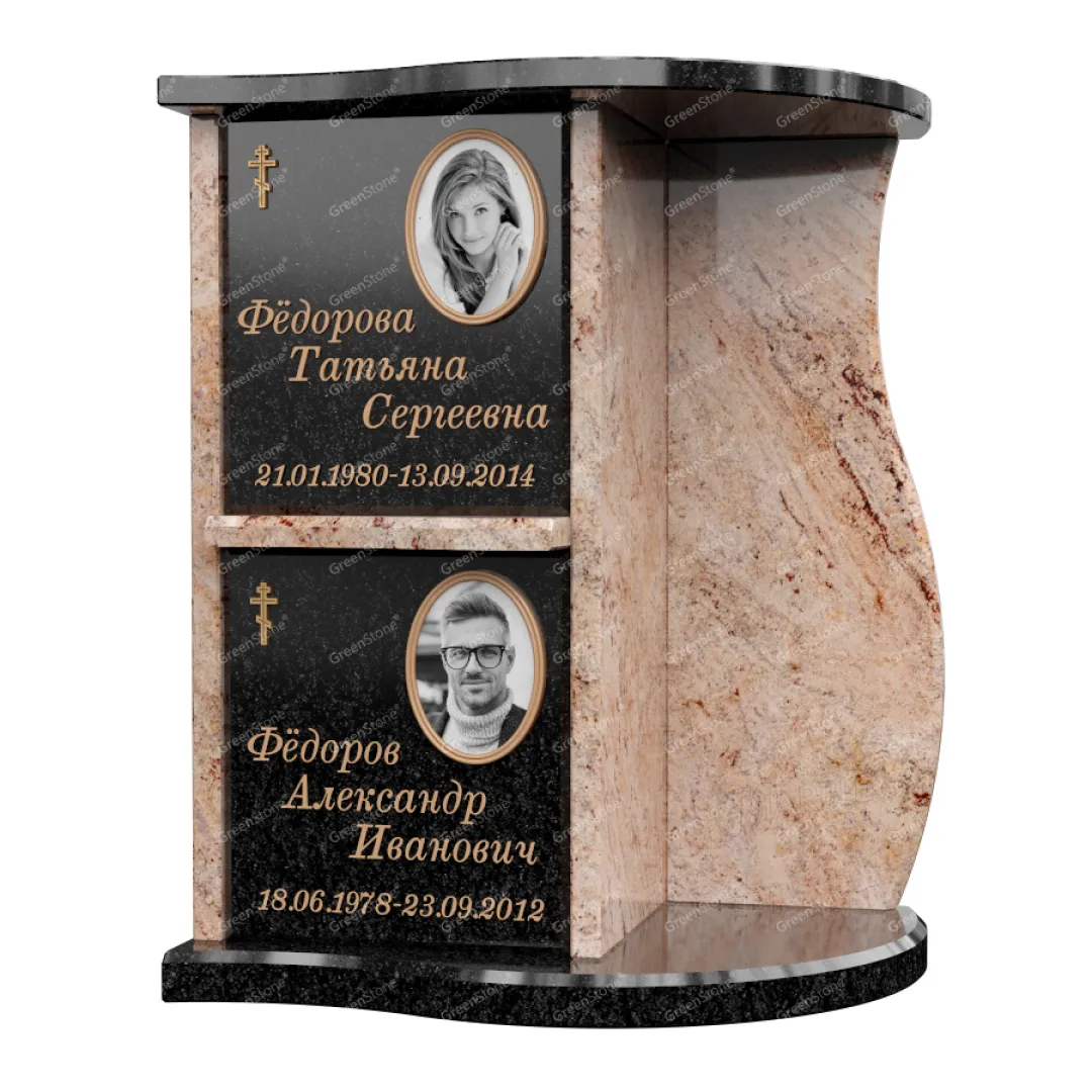 Кремация давно вошла в разряд привычных ритуальных услуг, а изготовление колумбариев стало обязательным элементом в портфолио услуг каждого серьезного изготовителя памятников. Изделие КЛ-03-3 является представителем данной линии продукции компании Грин-Стоун. Каждый наш колумбарий мы изготавливаем из двух видов камня. В данном исполнении основным является черный Габбро-Диабаз (Россия), а цветной Shivakashi Pink (Индия) дополняет композицию и усиливает восприятие изделия в целом.