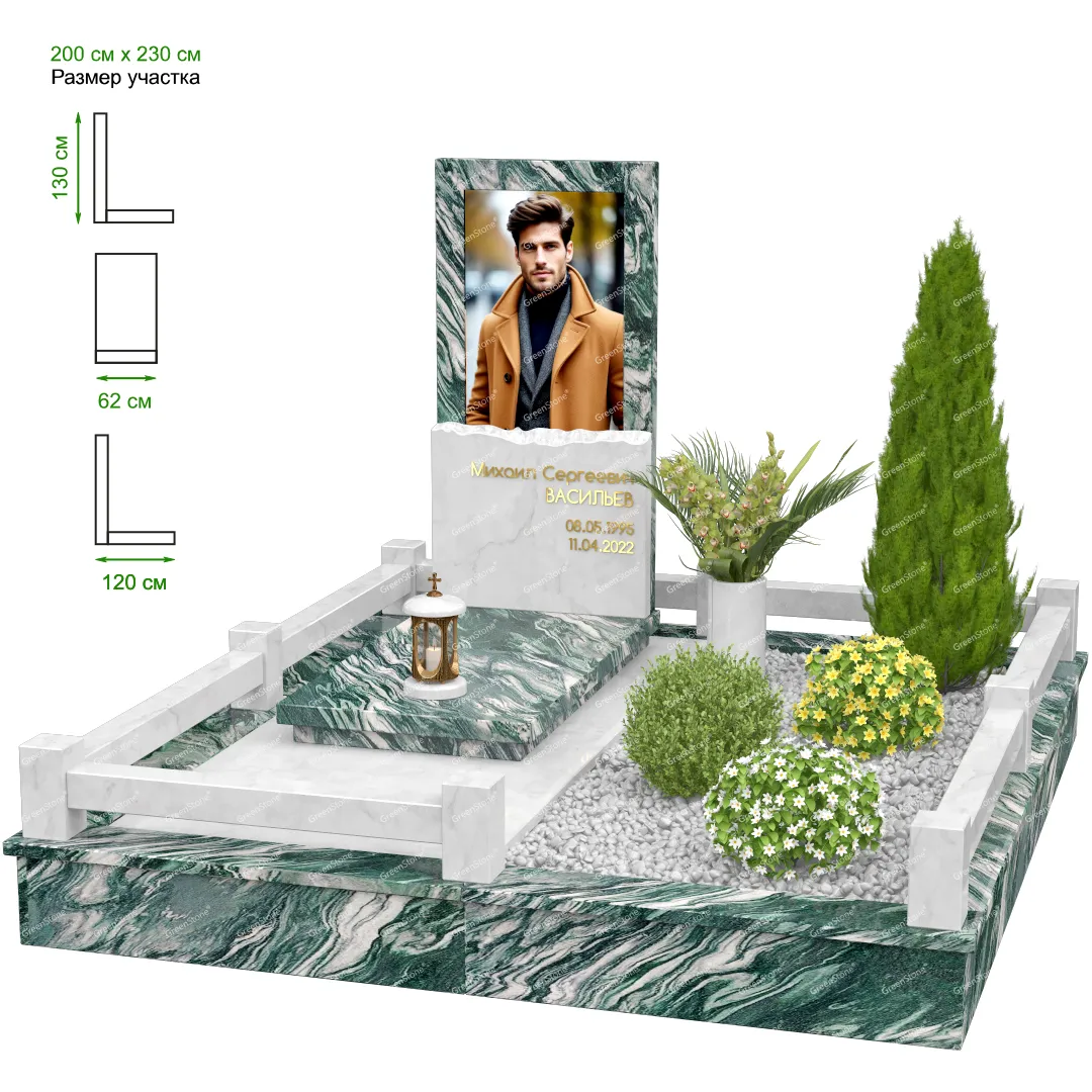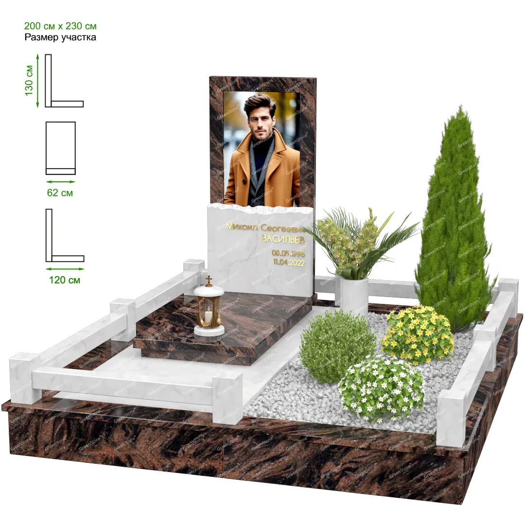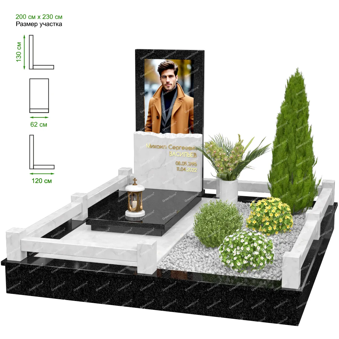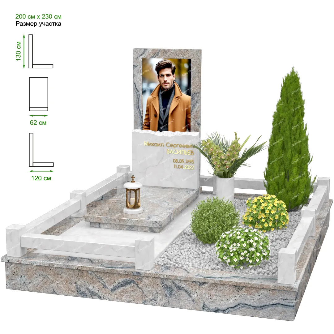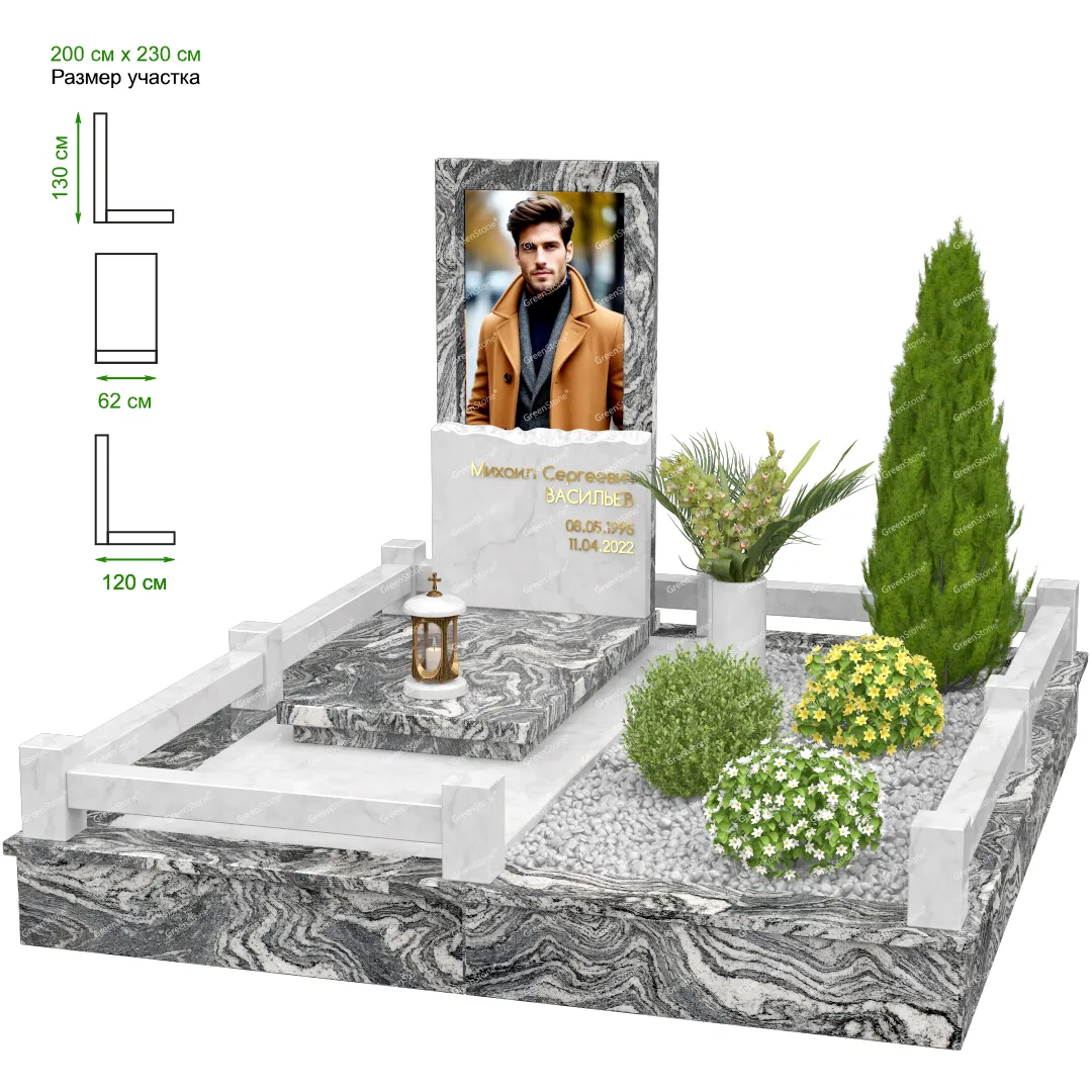 Мемориальный комплекс или просто мемориал модели – это сложное изделие из натурального гранита, включающее в себя сам памятник, ограду и предварительно проработанный вариант установки. Для изготовления модели MS-18 использовано сочетание гранитов Blue Pearl (Индия) и Коелга (Россия). Благодаря этому мемориал выглядит дорого и основательно. Художественный образ, может быть дополнен монтажом бронзовых аксессуаров итальянского бренда Caggiati, включая изысканные буквы, формирующие надпись на стеле.