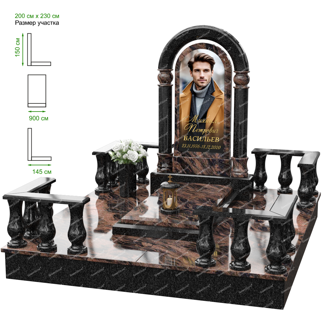 Мемориальный комплекс или просто мемориал модели – это сложное изделие из натурального гранита, включающее в себя сам памятник, ограду и предварительно проработанный вариант установки. Для изготовления модели MS-20 использовано сочетание гранитов Габбро-Диабаз (Россия) и Indian Aurora (Индия). Благодаря этому мемориал выглядит дорого и основательно. Художественный образ, может быть дополнен монтажом бронзовых аксессуаров итальянского бренда Caggiati, включая изысканные буквы, формирующие надпись на стеле.