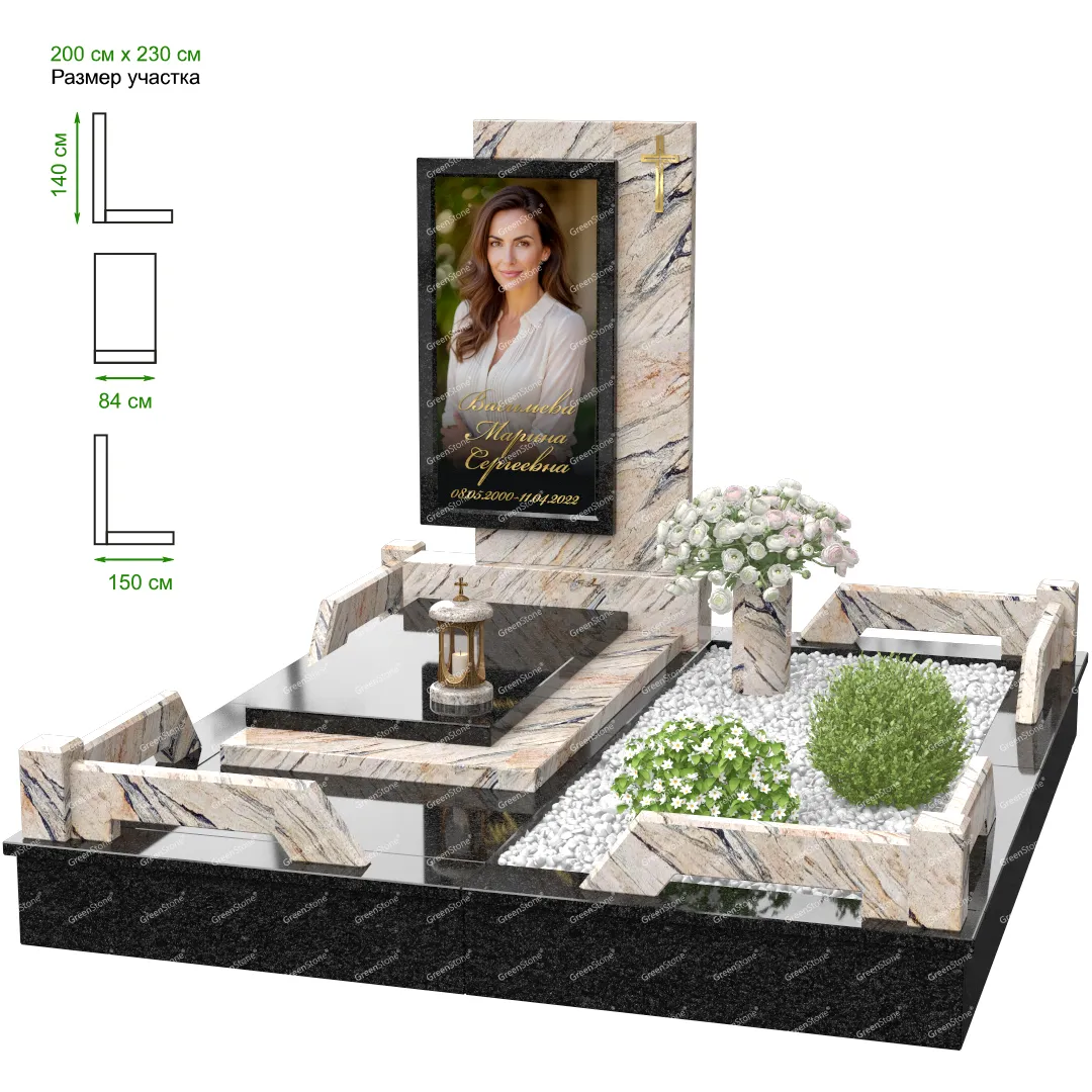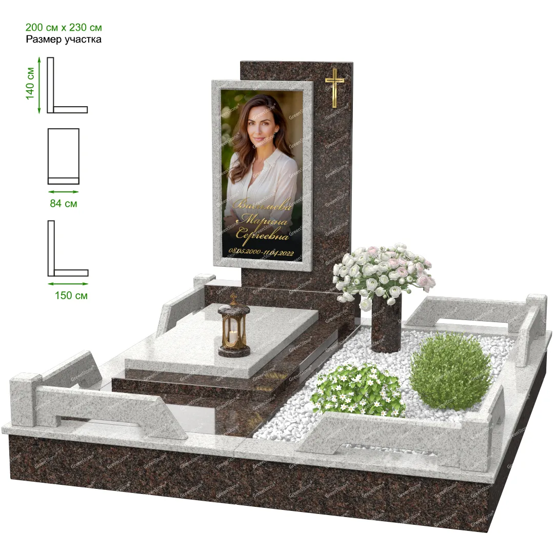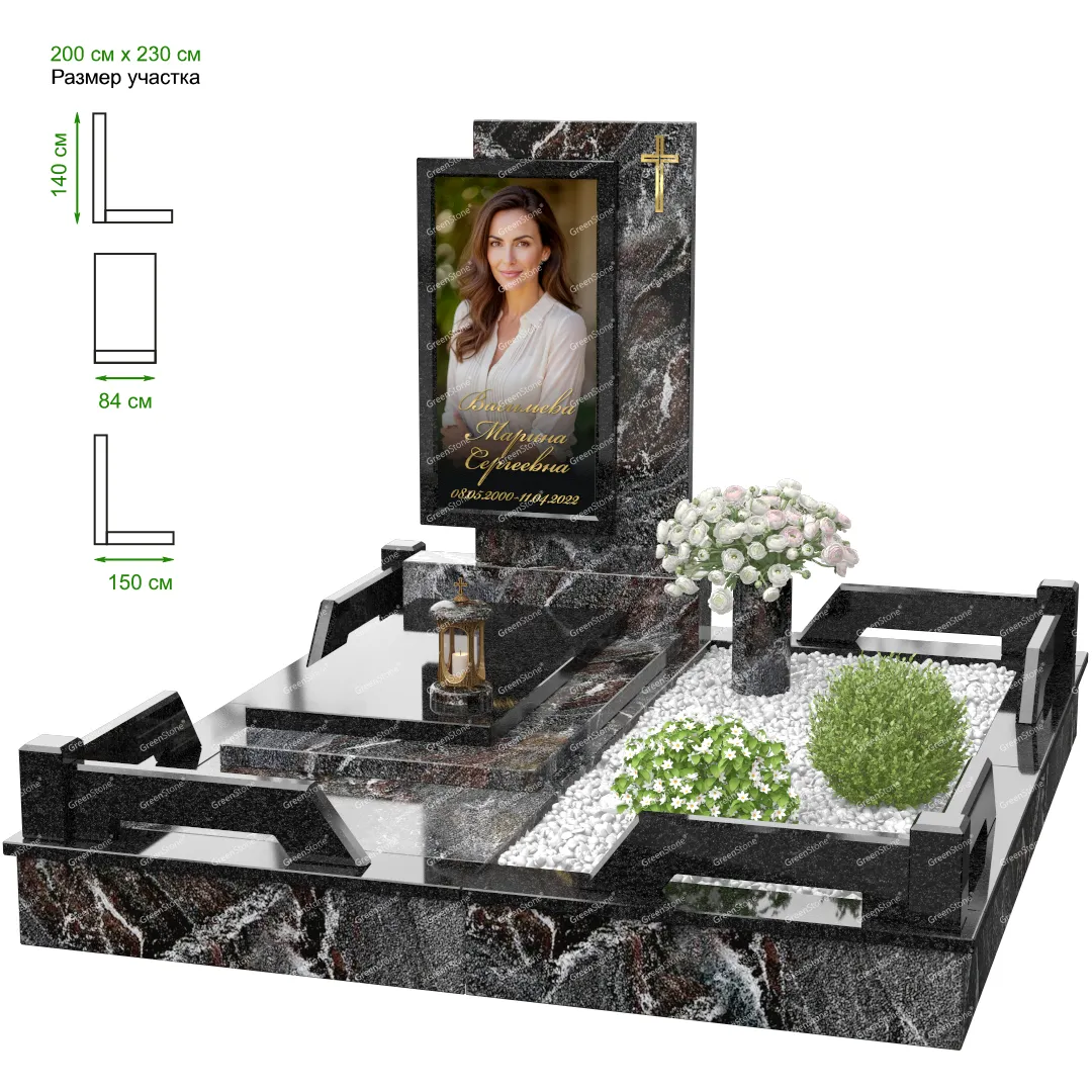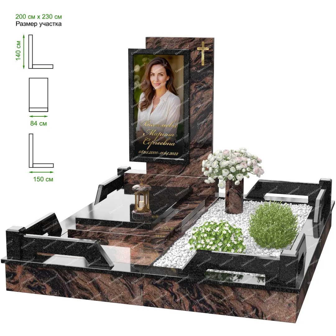 Мемориальный комплекс или просто мемориал модели – это сложное изделие из натурального гранита, включающее в себя сам памятник, ограду и предварительно проработанный вариант установки. Для изготовления модели MS-24 использовано сочетание гранитов Коелга (Россия) и Indian Green (Индия). Благодаря этому мемориал выглядит дорого и основательно. Художественный образ, может быть дополнен монтажом бронзовых аксессуаров итальянского бренда Caggiati, включая изысканные буквы, формирующие надпись на стеле.