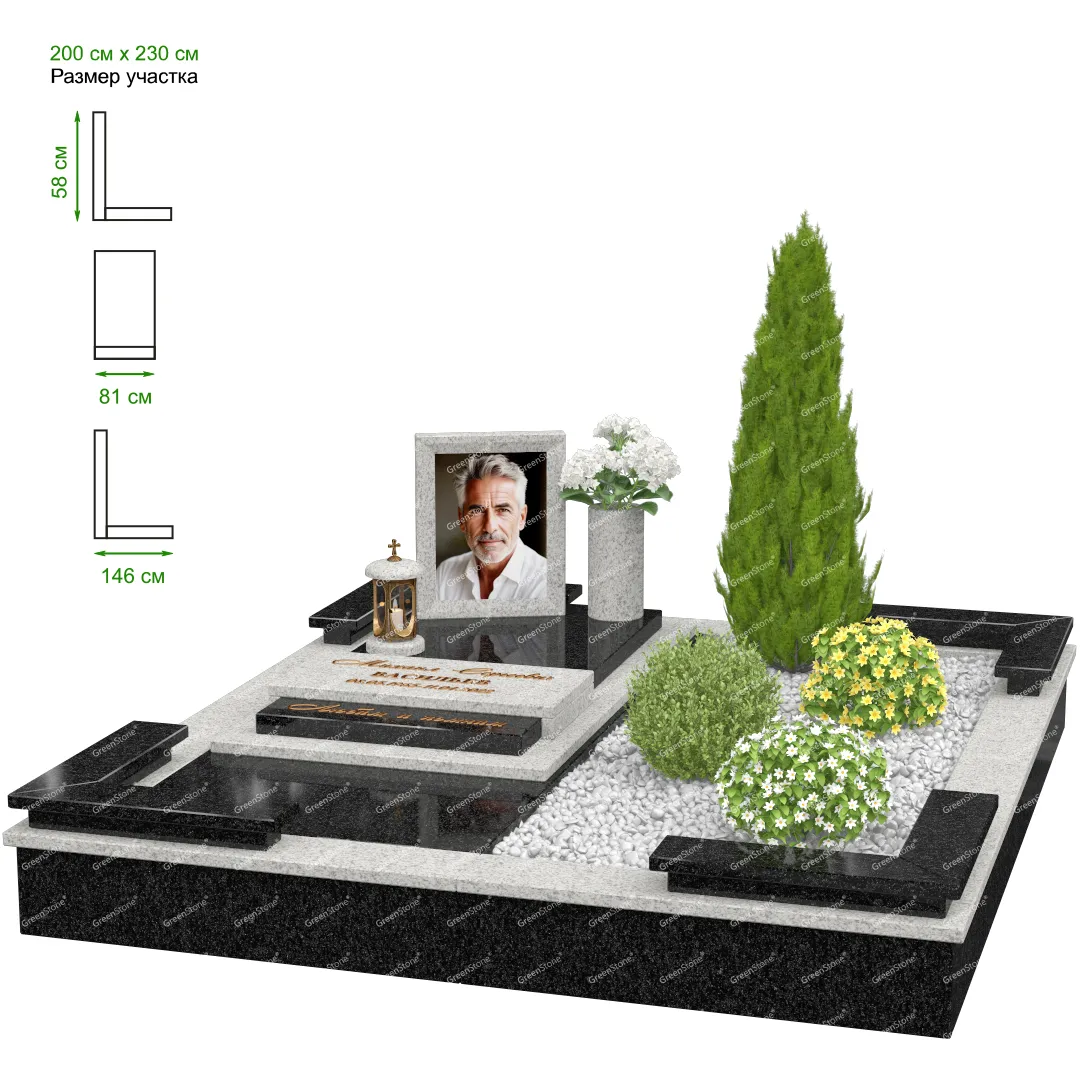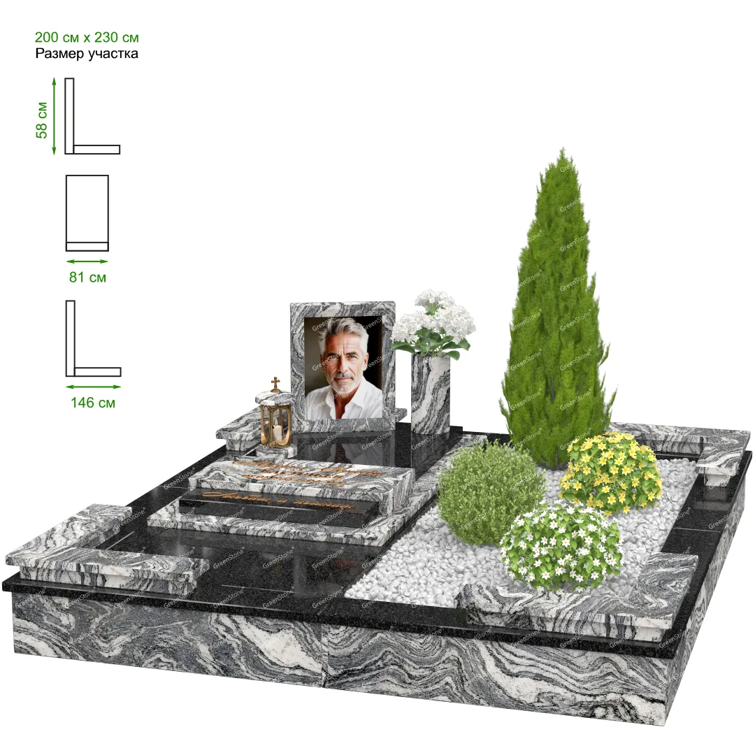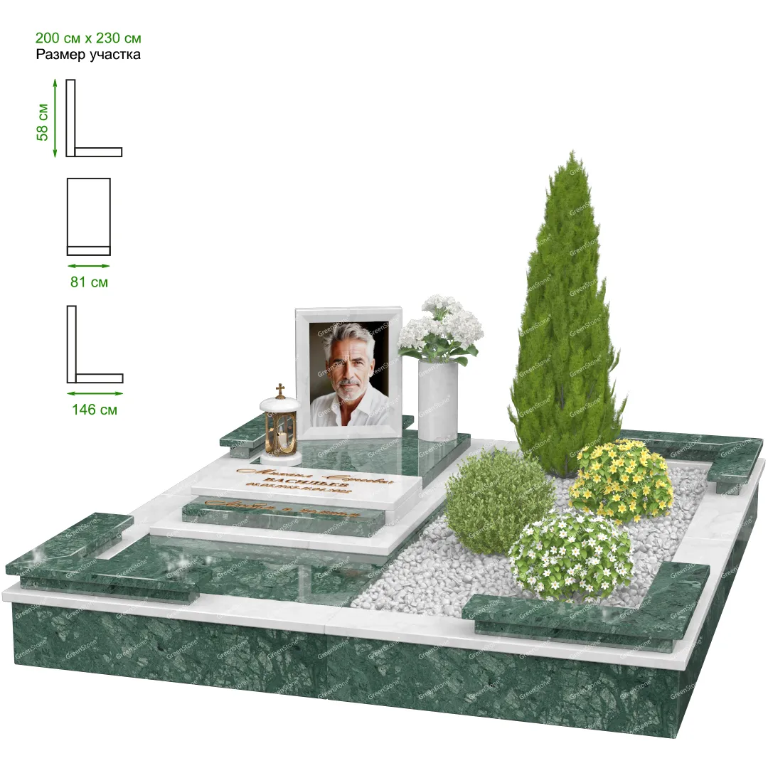 Мемориальный комплекс или просто мемориал модели – это сложное изделие из натурального гранита, включающее в себя сам памятник, ограду и предварительно проработанный вариант установки. Для изготовления модели MS-32 использовано сочетание гранитов Indian Green (Индия) и Коелга (Россия). Благодаря этому мемориал выглядит дорого и основательно. Художественный образ, может быть дополнен монтажом бронзовых аксессуаров итальянского бренда Caggiati, включая изысканные буквы, формирующие надпись на стеле.
