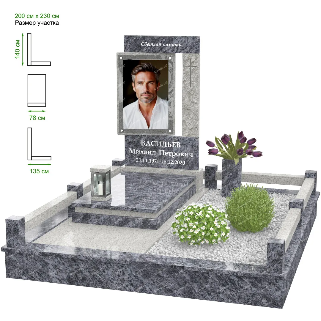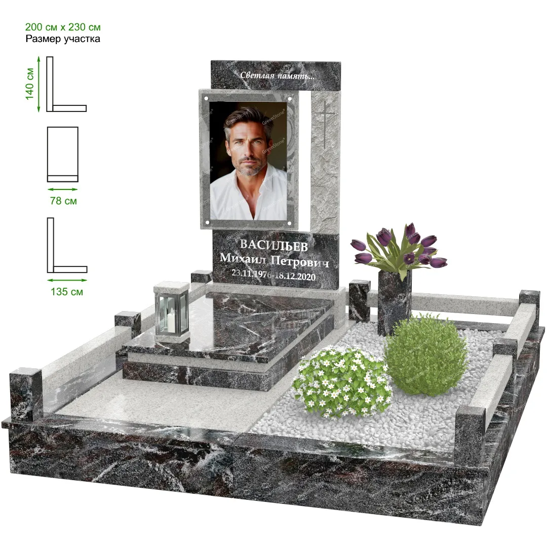 Мемориальный комплекс или просто мемориал модели – это сложное изделие из натурального гранита, включающее в себя сам памятник, ограду и предварительно проработанный вариант установки. Для изготовления модели MS-34 использовано сочетание гранитов Гранатовый Амфиболит (Россия) и Мансуровский (Россия). Благодаря этому мемориал выглядит дорого и основательно. Художественный образ, может быть дополнен монтажом бронзовых аксессуаров итальянского бренда Caggiati, включая изысканные буквы, формирующие надпись на стеле.