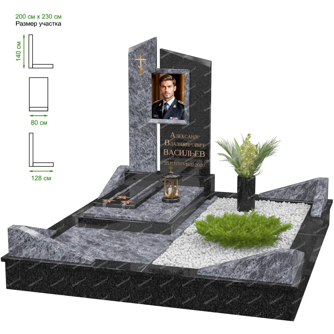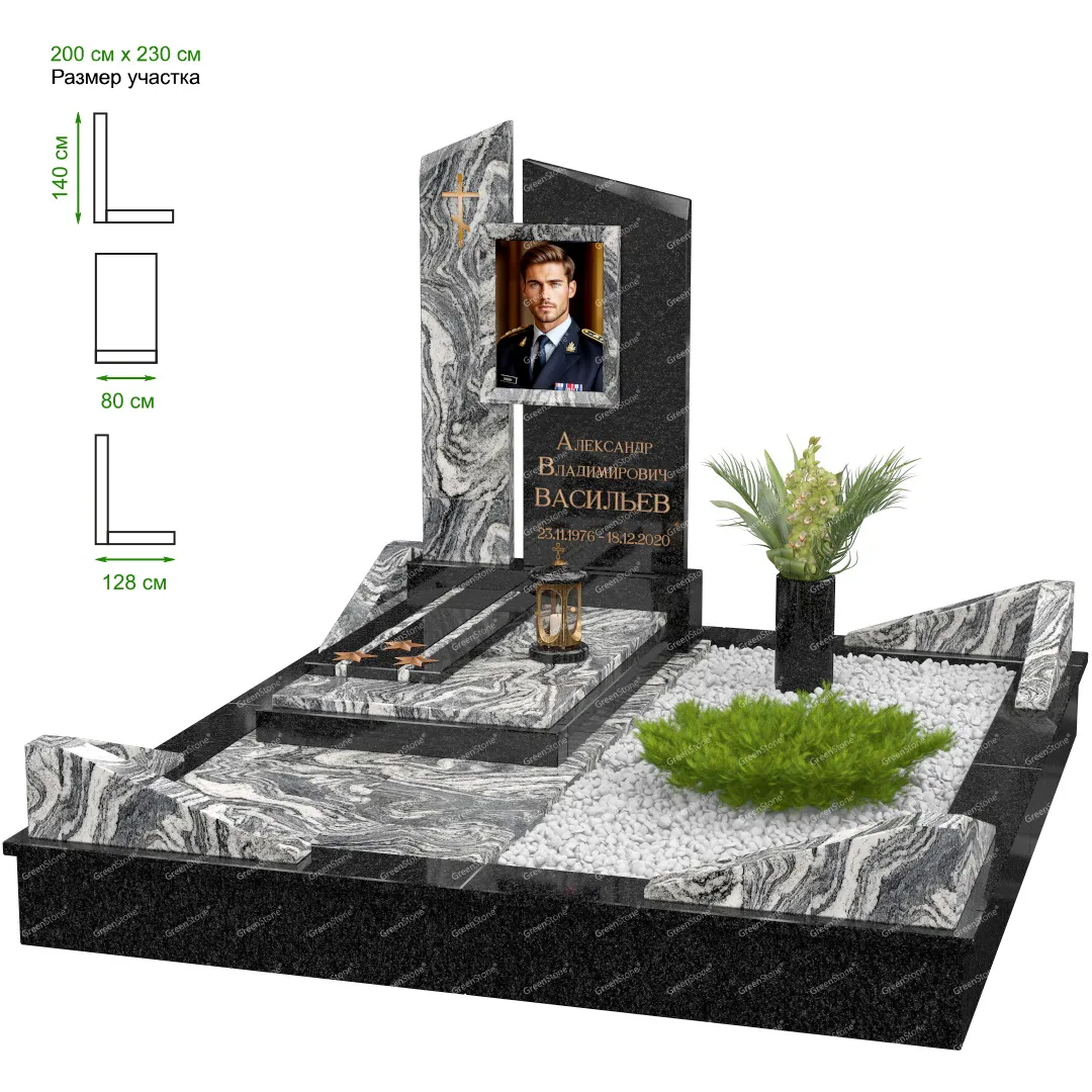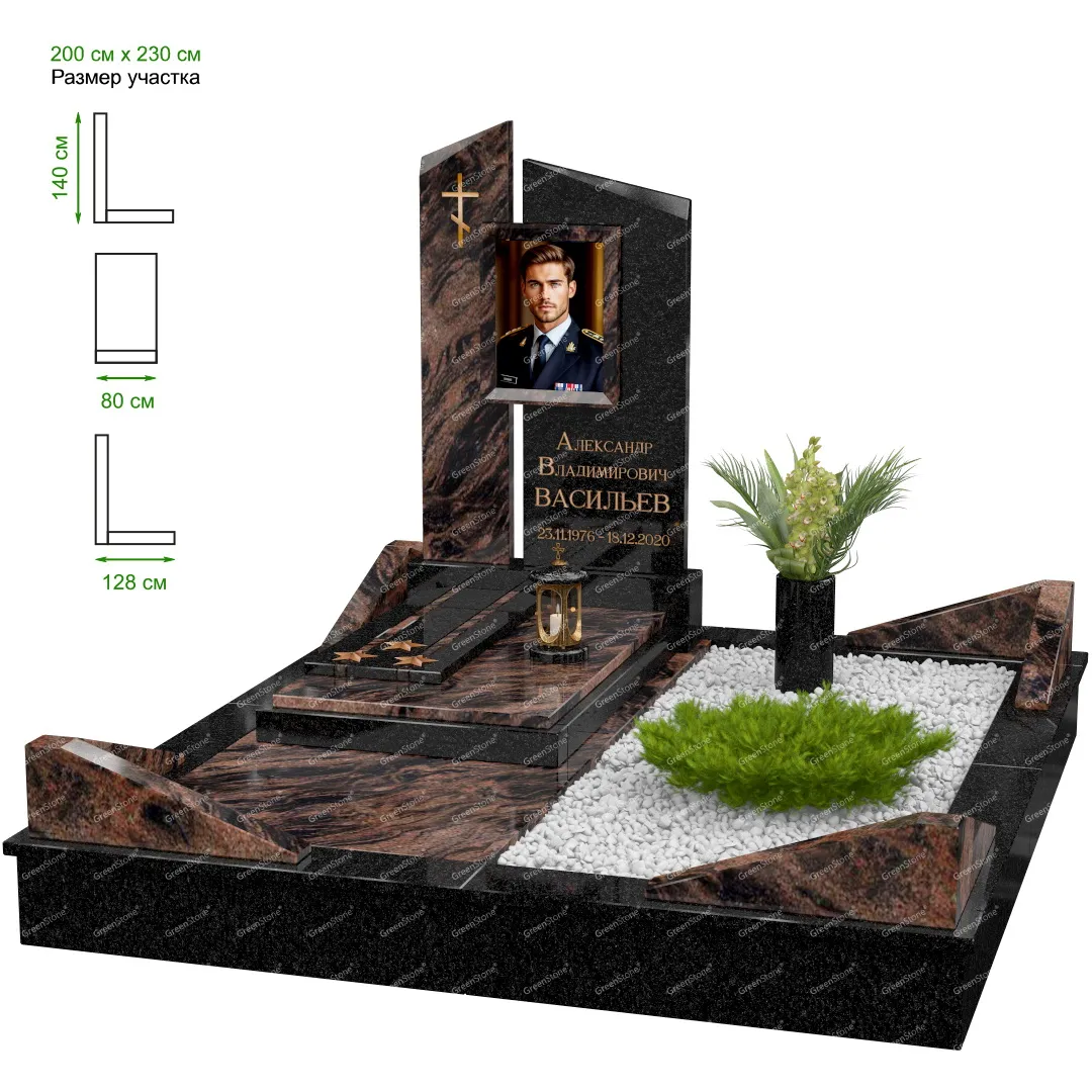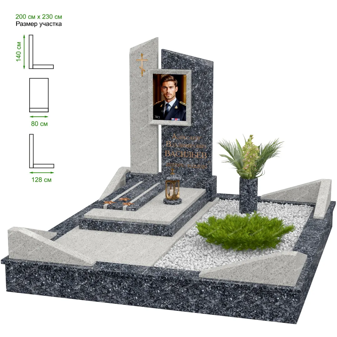 Мемориальный комплекс или просто мемориал модели – это сложное изделие из натурального гранита, включающее в себя сам памятник, ограду и предварительно проработанный вариант установки. Для изготовления модели MS-36 использовано сочетание гранитов Bahama Blue (Индия) и Габбро-диабаз (Россия). Благодаря этому мемориал выглядит дорого и основательно. Художественный образ, может быть дополнен монтажом бронзовых аксессуаров итальянского бренда Caggiati, включая изысканные буквы, формирующие надпись на стеле.
