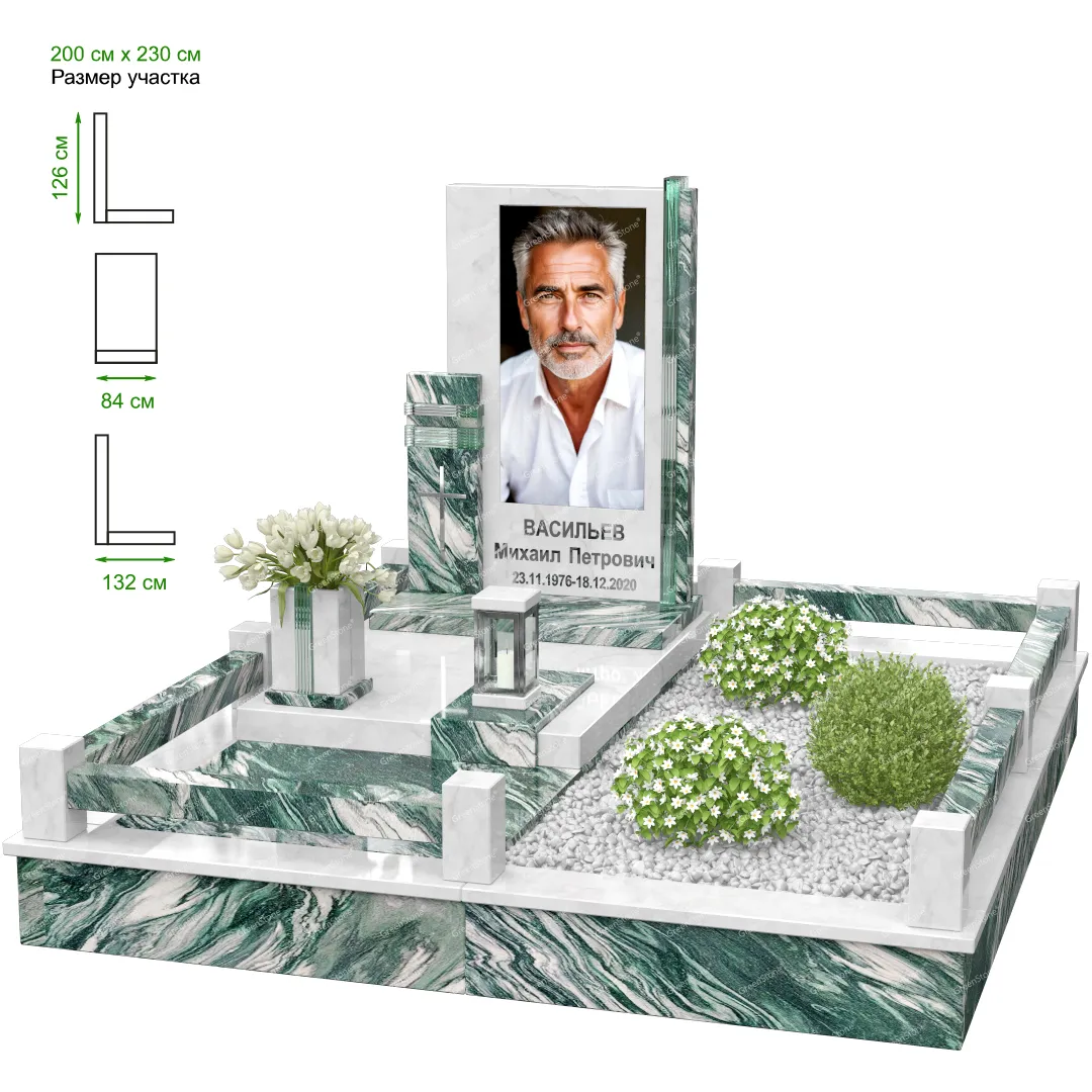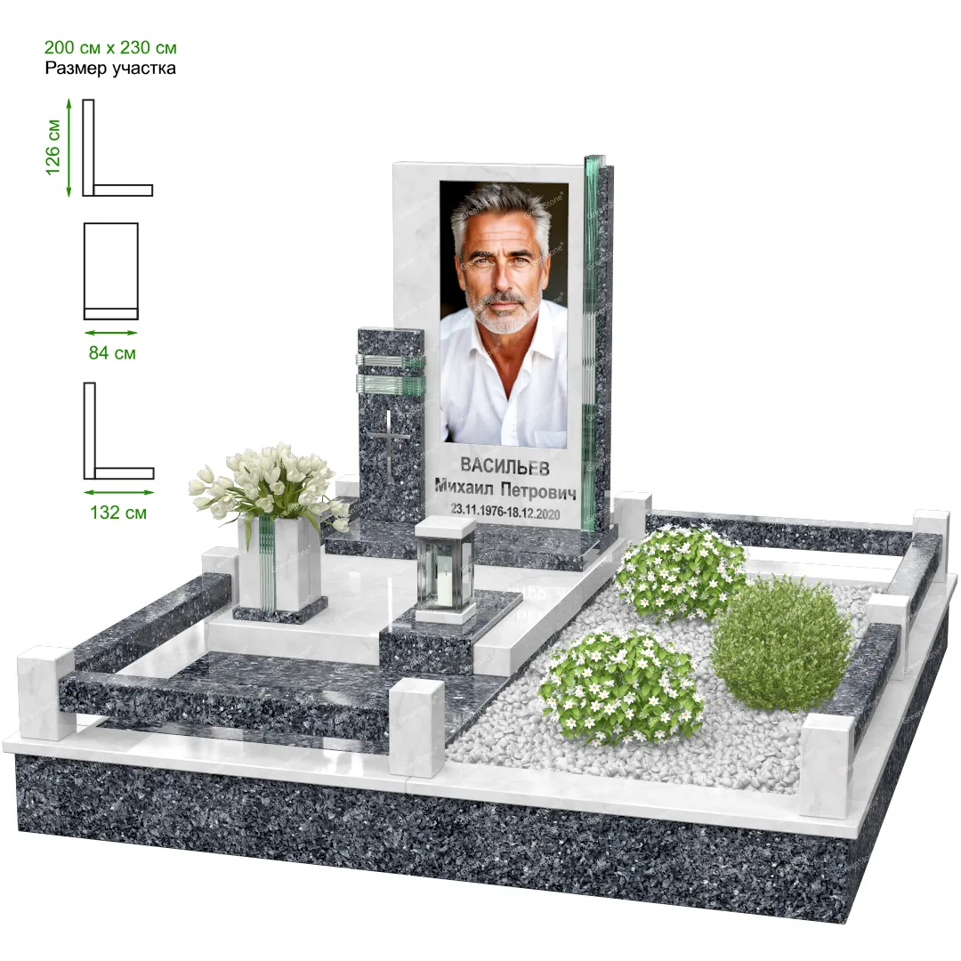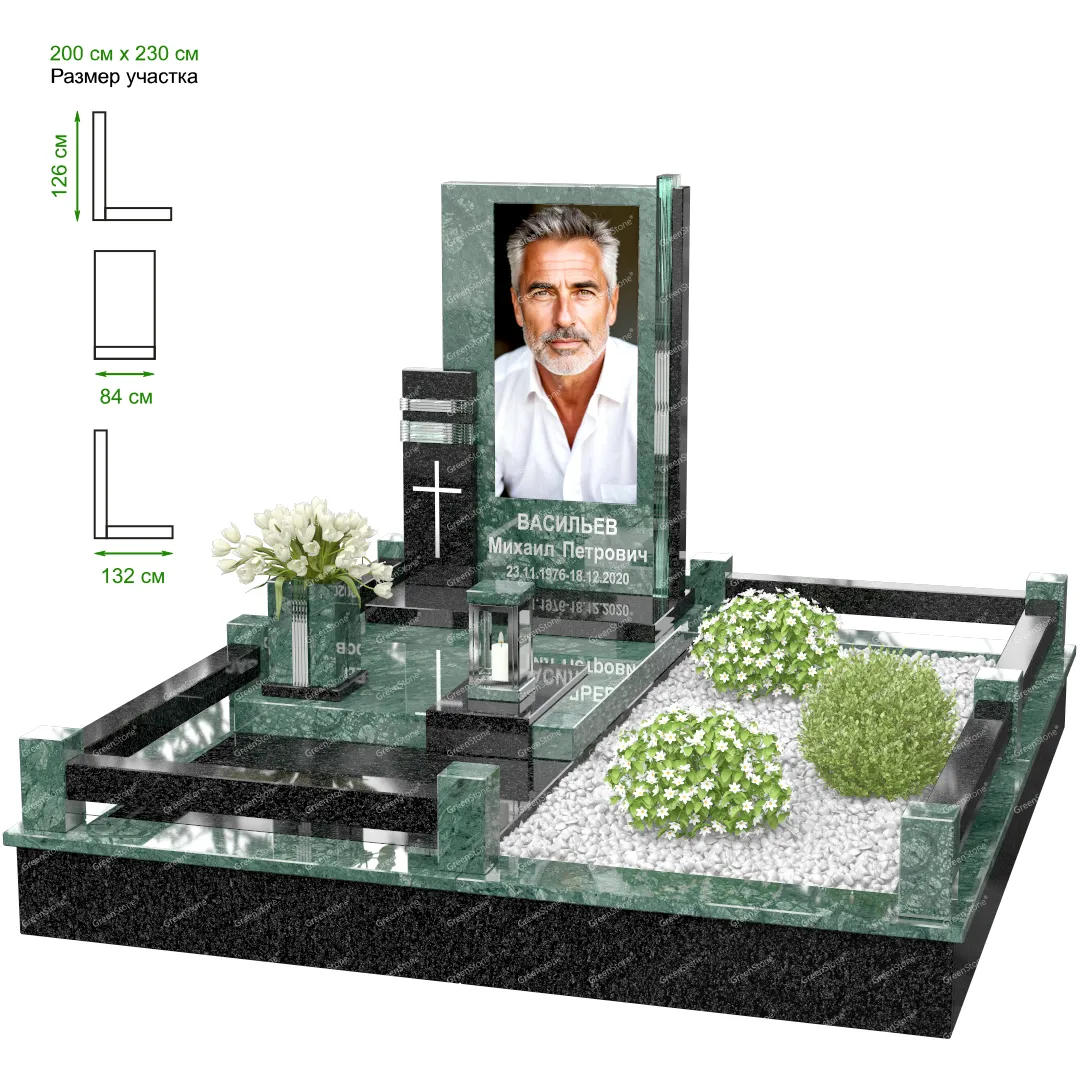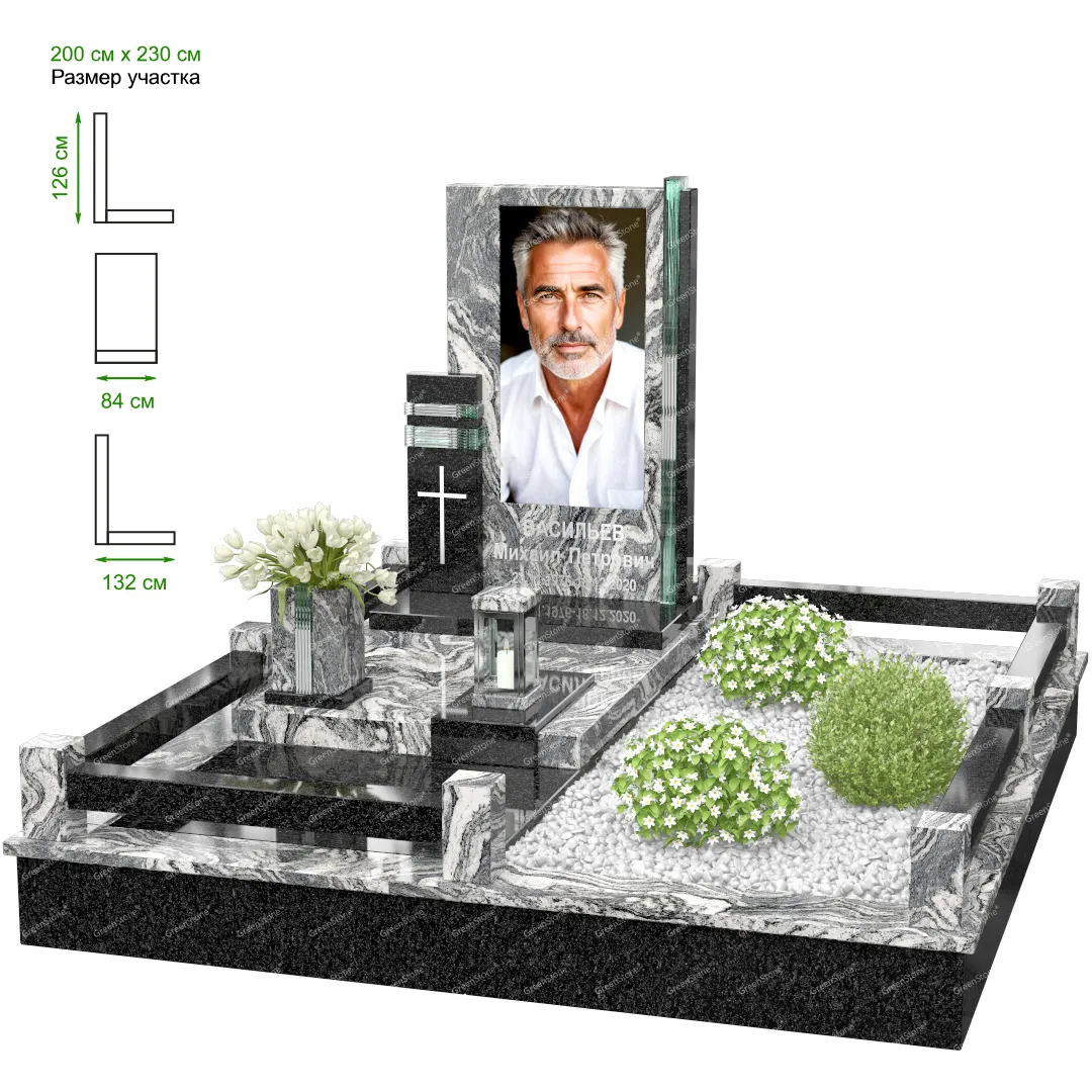 Мемориальный комплекс или просто мемориал модели – это сложное изделие из натурального гранита, включающее в себя сам памятник, ограду и предварительно проработанный вариант установки. Для изготовления модели MS-42 использовано сочетание гранитов Мансуровский (Россия) и Куру-Грей (Финляндия). Благодаря этому мемориал выглядит дорого и основательно. Художественный образ, может быть дополнен монтажом бронзовых аксессуаров итальянского бренда Caggiati, включая изысканные буквы, формирующие надпись на стеле.