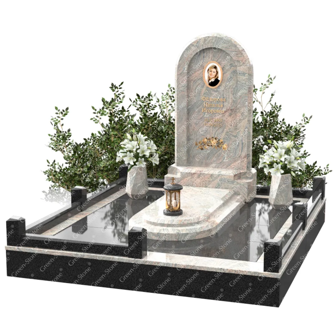 Мемориальный комплекс или просто мемориал модели – это сложное изделие из натурального гранита, включающее в себя сам памятник, ограду и предварительно проработанный вариант установки. Для изготовления модели MS-9 использовано сочетание гранитов Габбро-Диабаз (Россия) и Juparana (Индия). Благодаря этому мемориал выглядит дорого и основательно. Художественный образ, может быть дополнен монтажом бронзовых аксессуаров итальянского бренда Caggiati, включая изысканные буквы, формирующие надпись на стеле.