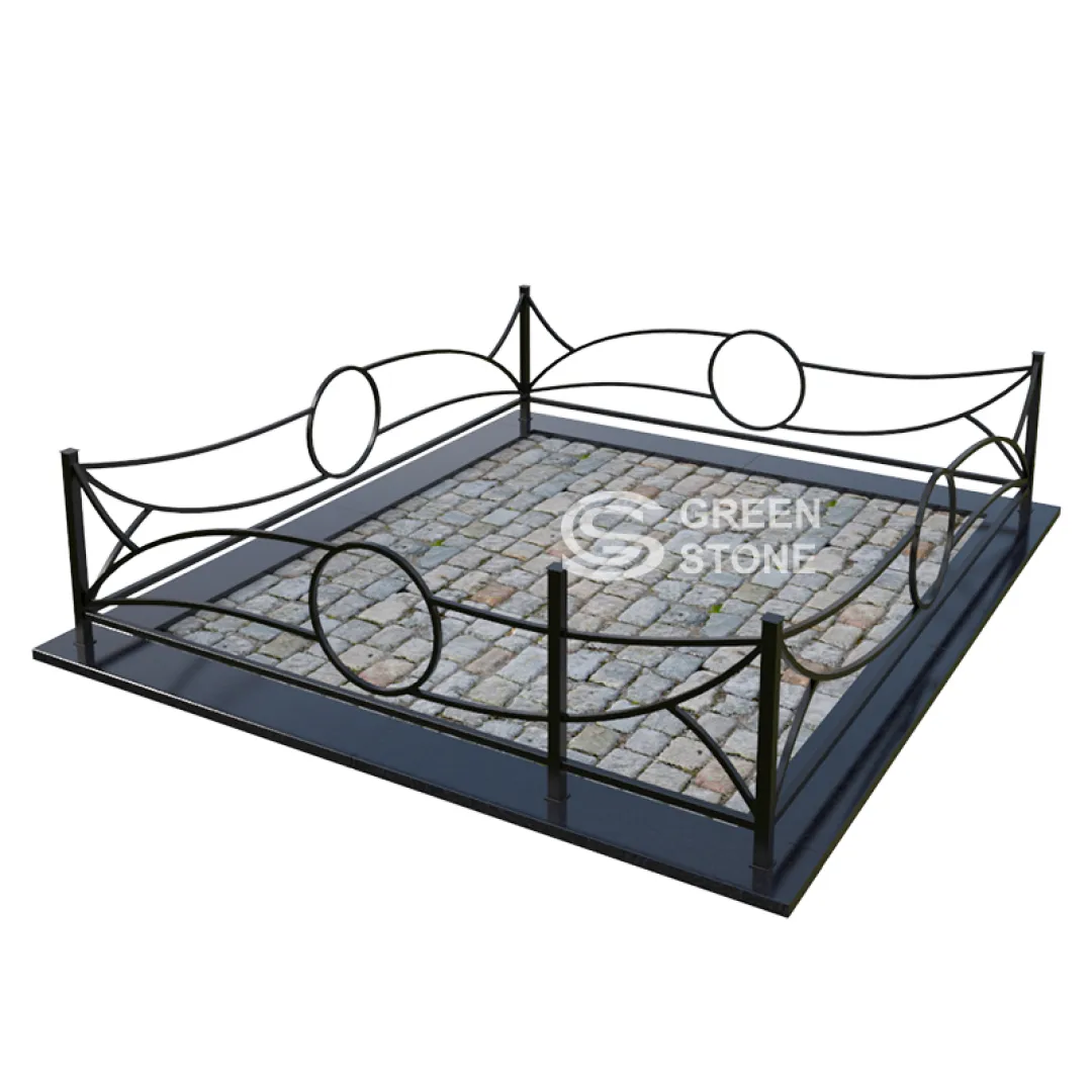 Металлическая ограда МО-25 размером 230×200см. является недорогим, но при этом универсальным решением для оформления захоронения. Практически любая ограда из металла прекрасно сочетается с любым гранитом – черным или цветным. А при правильной установке на фундамент вопросы к ее внешнему виду не должны возникать в течение достаточно долгого времени.