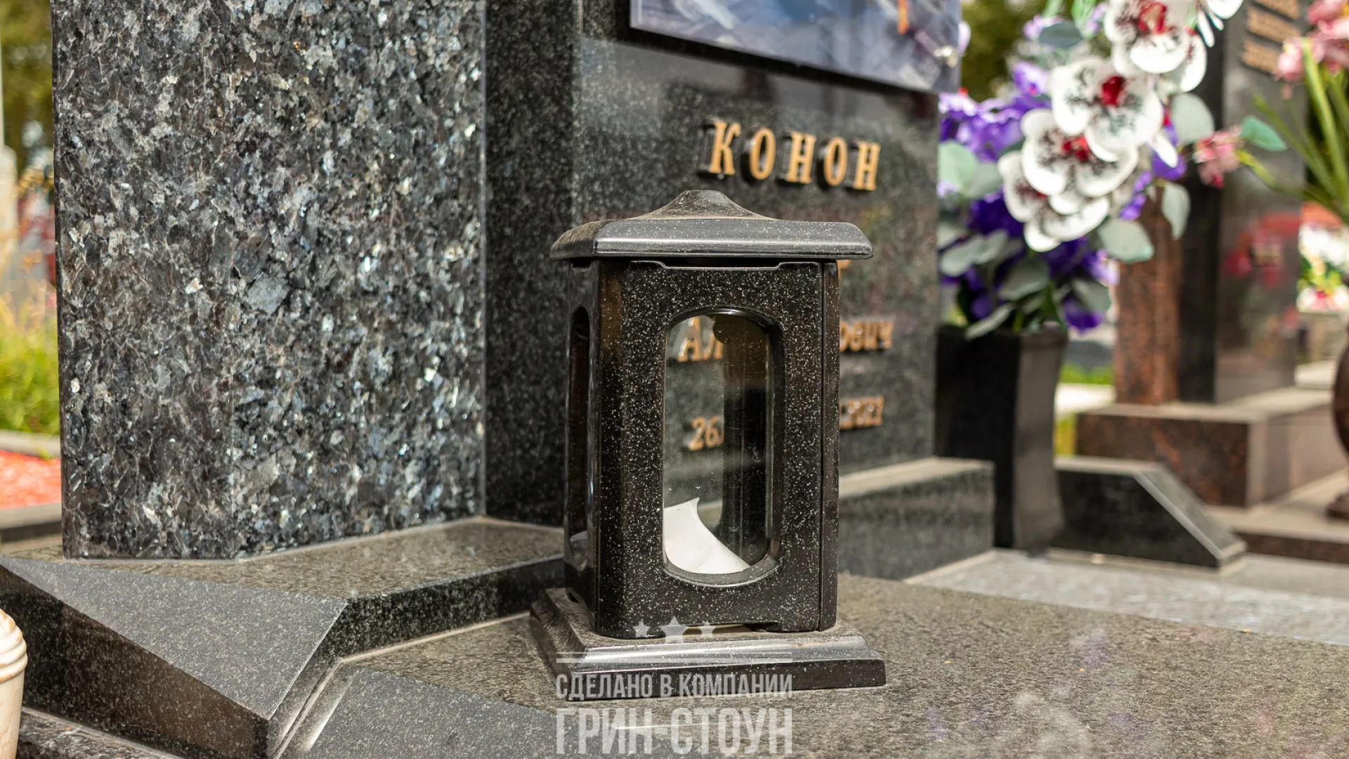 Оградой в композиции служат углы из габбро-диабаза. Борты спилены под углом, а столбики декорированы косыми фасками по аналогии с фасками на горизонтальных надгробных плитах и чёрной стеле. В качестве аксессуаров выбраны вазы и лампада лаконичной формы из полимербетона. Поверхность участка закрывает плитка из карельского габбро-диабаза. Из этого же камня изготовлены элементы памятника и ограда.