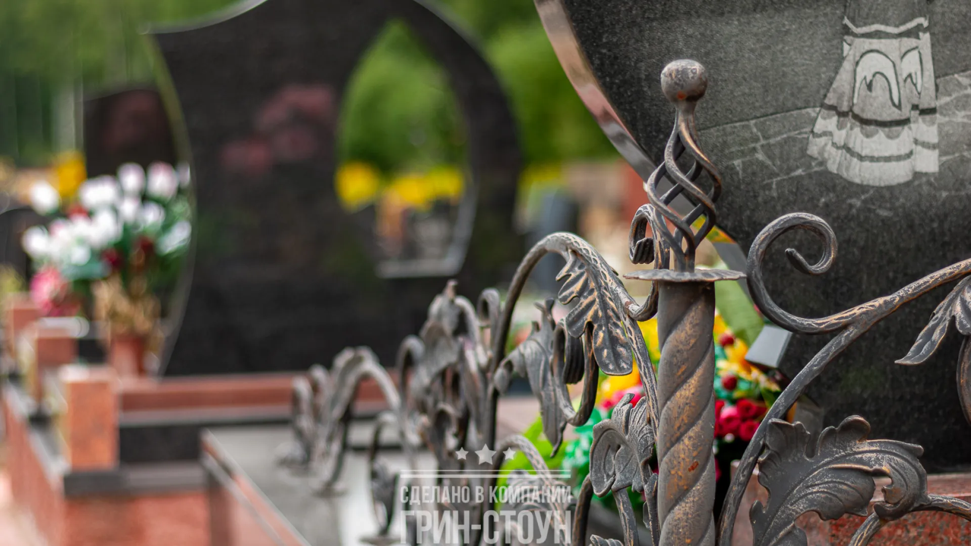 Форму сердца памятника идеально дополняет ограда из ковки. Конечно, более практичным вариантом будет ограда из камня, однако кованая ограда выглядит более легко и изящно. Участок благоустроен гранитной плиткой, фундамент из блоков полностью облицован гранитом.