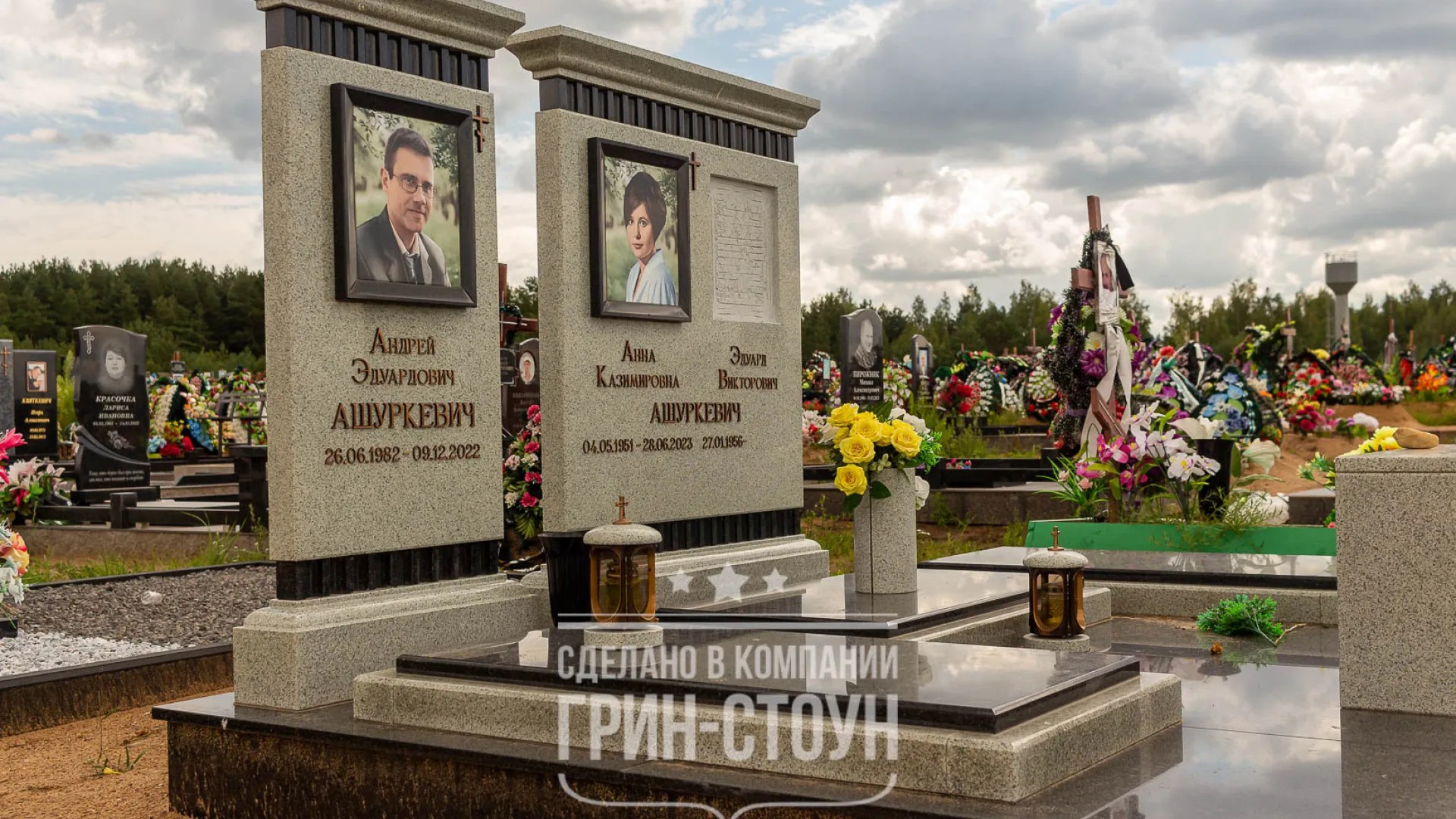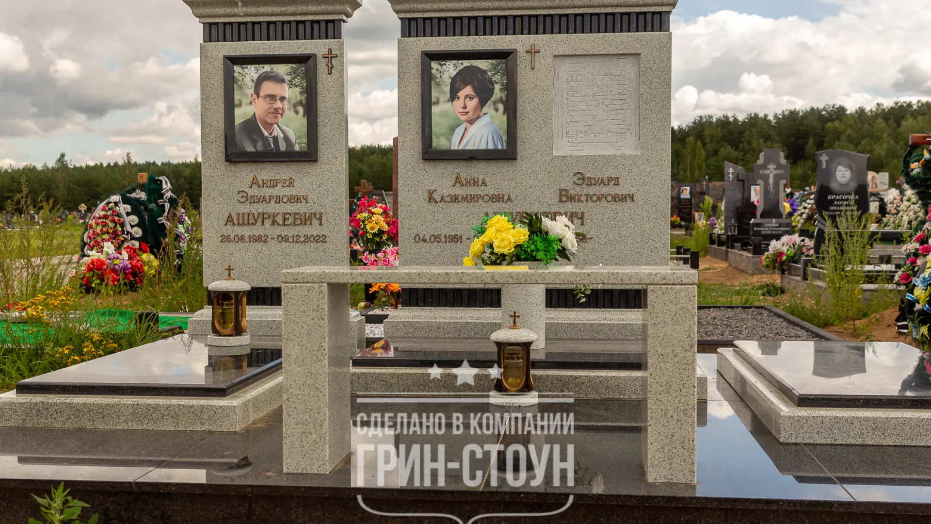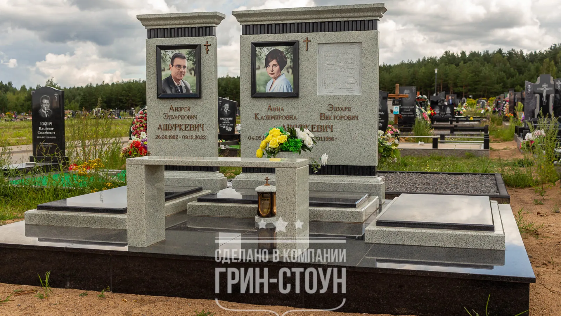 Мемориальный комплекс на троих установлен на Лесном кладбище. На данный момент на участке два захоронения, но есть возможность подхоронить способом кремации как минимум трёх человек, этот момент мы предусмотрели по желанию заказчиков, оставив под надгробными плитами ниши в граните.