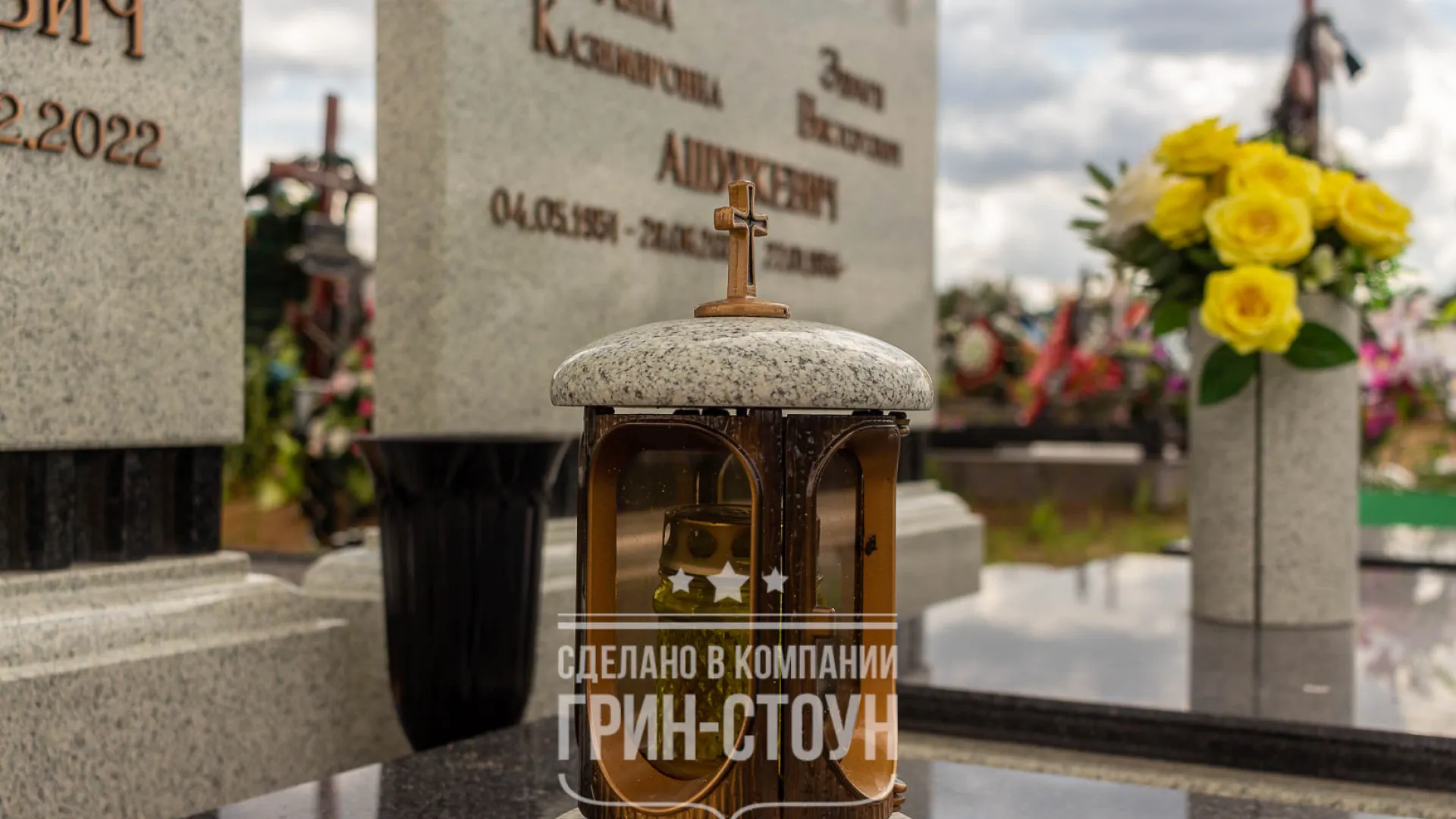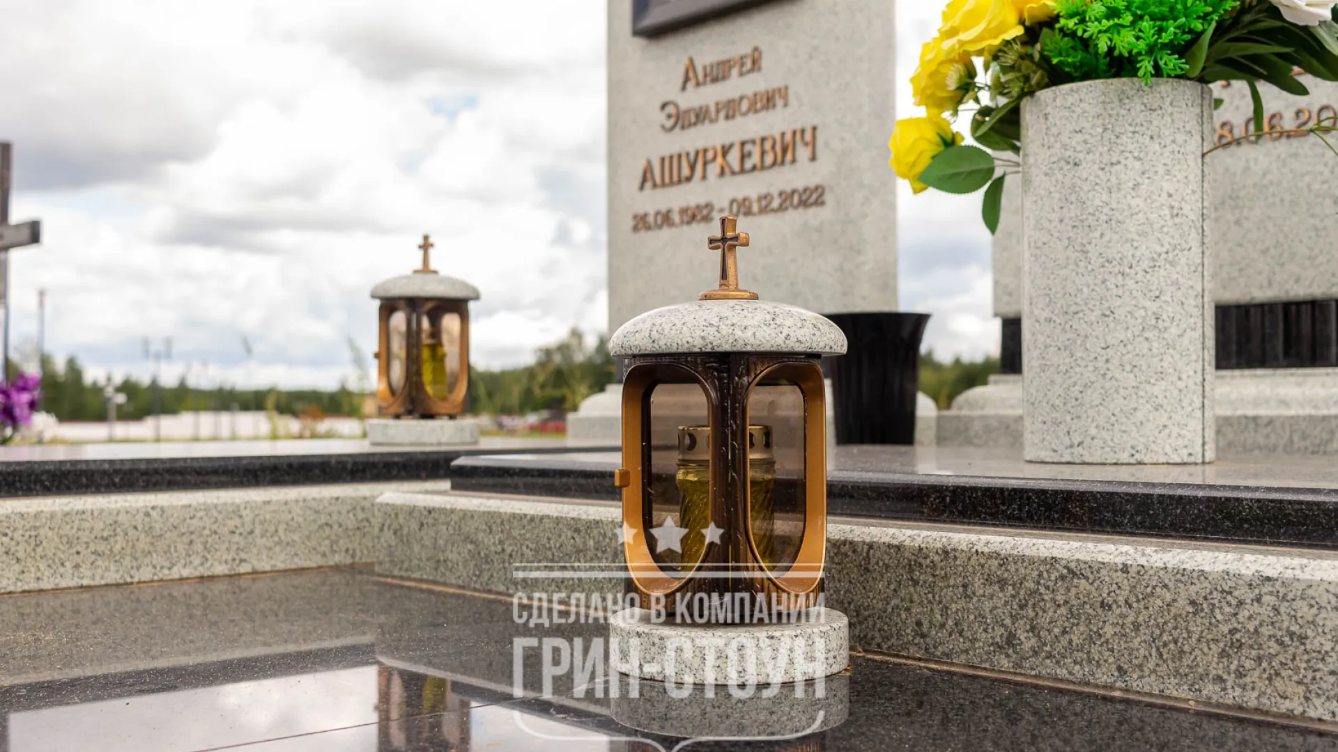 Из аксессуаров использованы гранитные лампады и разрезная ваза из мансуровского гранита. Разрезные вазы - отличный способ дополнения мемориального комплекса, учитывая, что за ними не нужен уход. Можно быть уверенными, что такая ваза сохранит свою целостность зимой, потому что в ней не собирается вода. Минималистичная скамейка - функциональное дополнение комплекса. Заказчики остались довольны памятником, а мы приобрели новый опыт в изготовлении традиционного мемориального комплекса в современном стиле.