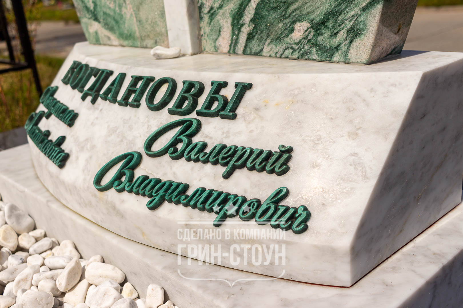 Оформление памятника - это отдельная интересная история. Текст изготовлен из двух материалов: нержавеющей стали без полировки, матовой, и бронзы с искусственным окислением. Бронза с зеленением идеально сочетается с цветом кварцита, но даты зелёного цвета были бы не видны на зелёном камне, потому их сделали из практичной нержавеющей стали. Что касается бронзы, то сложность изготовления букв была в том, что форма тумбы имеет радиус скругления и сужается к верху, потому и буквы должны были быть изготовлены не прямыми, как на обычную прямую стелу, а с необходимым радиусом и изгибом, это требовало определённой изобретательности.