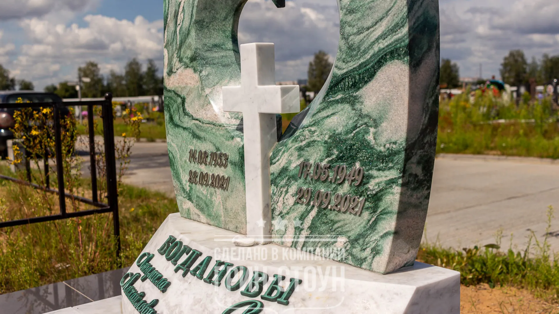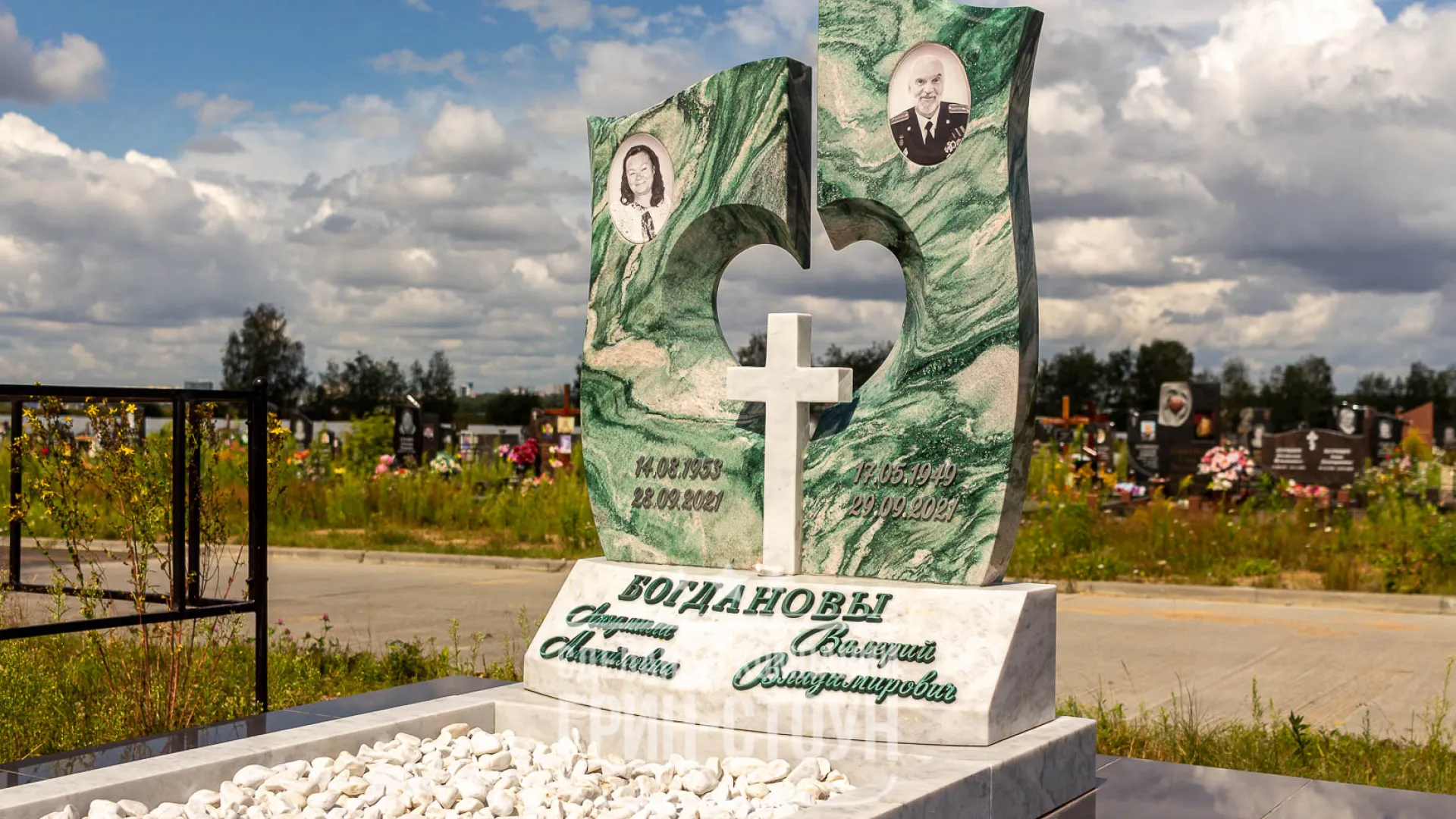 Памятник близким заказывали родственники. Достаточно большим и дружным составом они приезжали вместе для обсуждения и оформления заказа, каждое решение принималось коллегиально, иногда даже методом голосования. Форма памятника была в нашем каталоге, но в неё заказчики попросили внести изменения. По причине множества мнений мы предложили заказчикам не менее десяти различных проектов, каждый из которых детально обсуждался по конструкции, цвету, практичности материала, эстетичности. В итоге выбор был сделан в пользу композиции с открытым цветником из кварцита Arctic Green и российского мрамора Коелга.