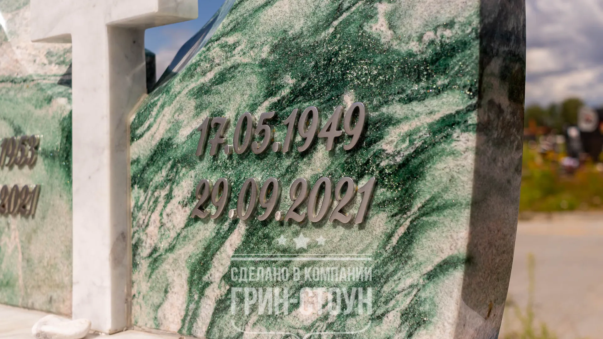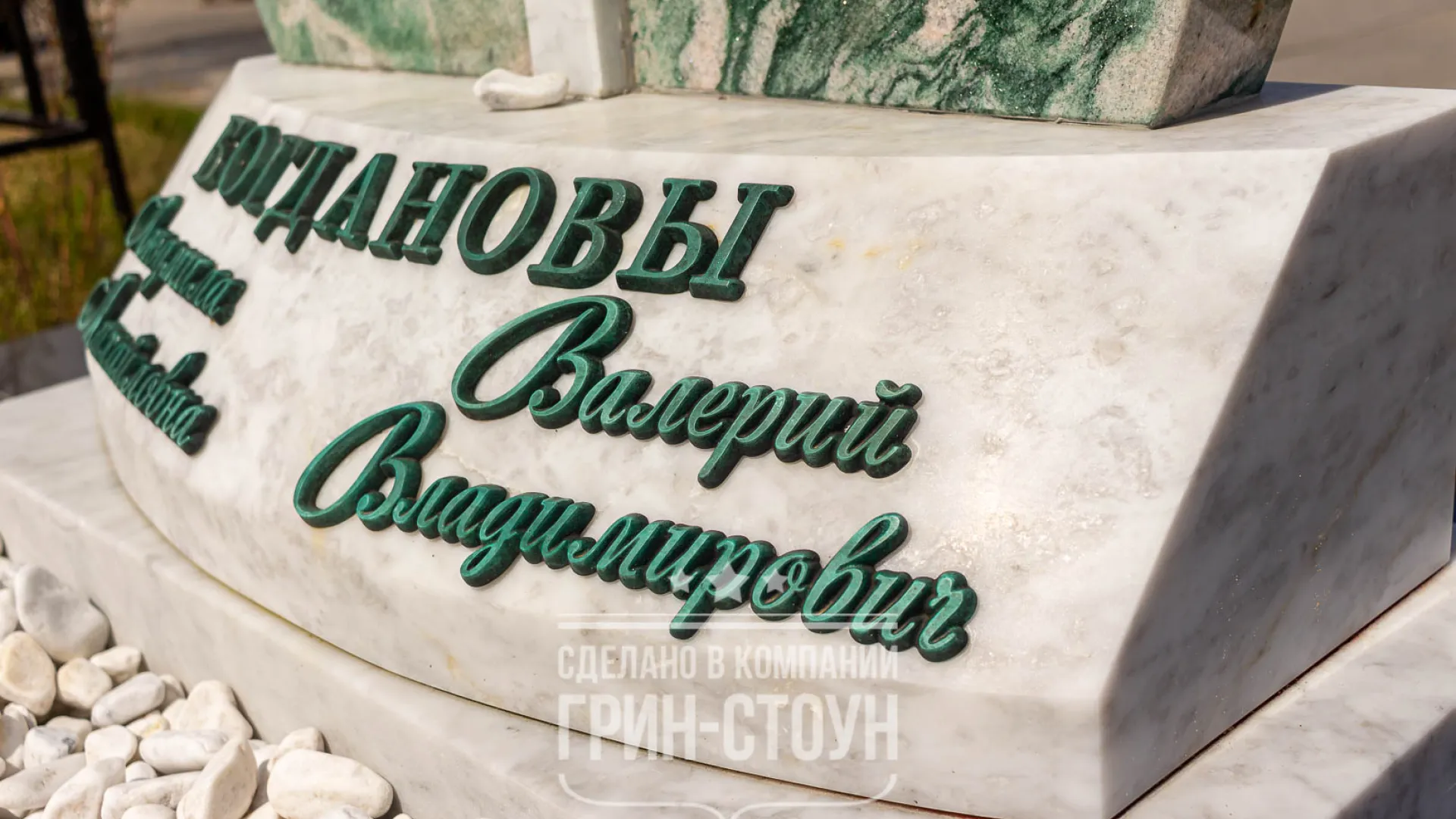 Оформление памятника - это отдельная интересная история. Текст изготовлен из двух материалов: нержавеющей стали без полировки, матовой, и бронзы с искусственным окислением. Бронза с зеленением идеально сочетается с цветом кварцита, но даты зелёного цвета были бы не видны на зелёном камне, потому их сделали из практичной нержавеющей стали. Что касается бронзы, то сложность изготовления букв была в том, что форма тумбы имеет радиус скругления и сужается к верху, потому и буквы должны были быть изготовлены не прямыми, как на обычную прямую стелу, а с необходимым радиусом и изгибом, это требовало определённой изобретательности.