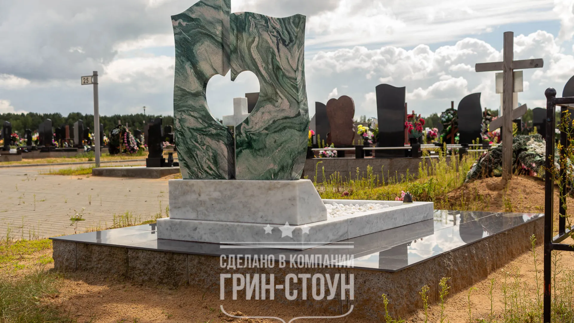 Семейный памятник в виде сердца с крестом из кварцита Arctic Green