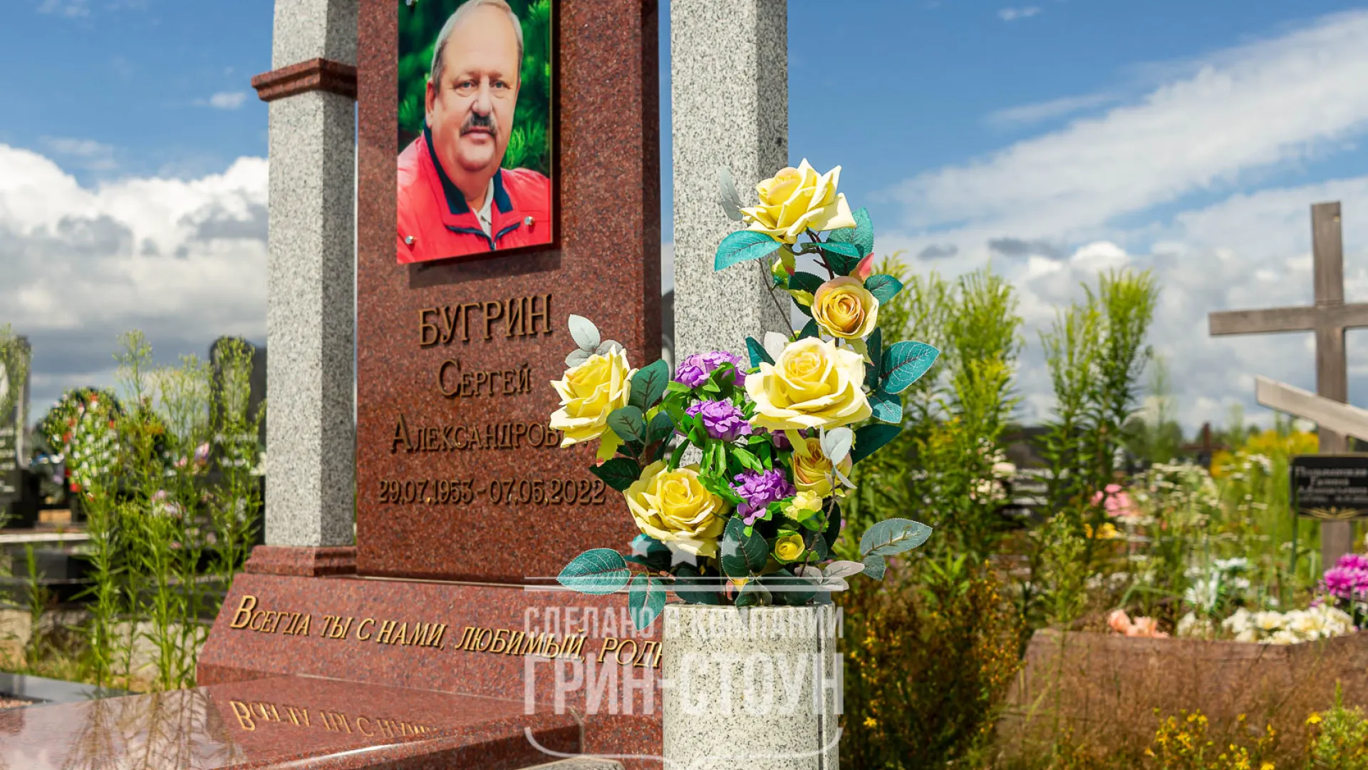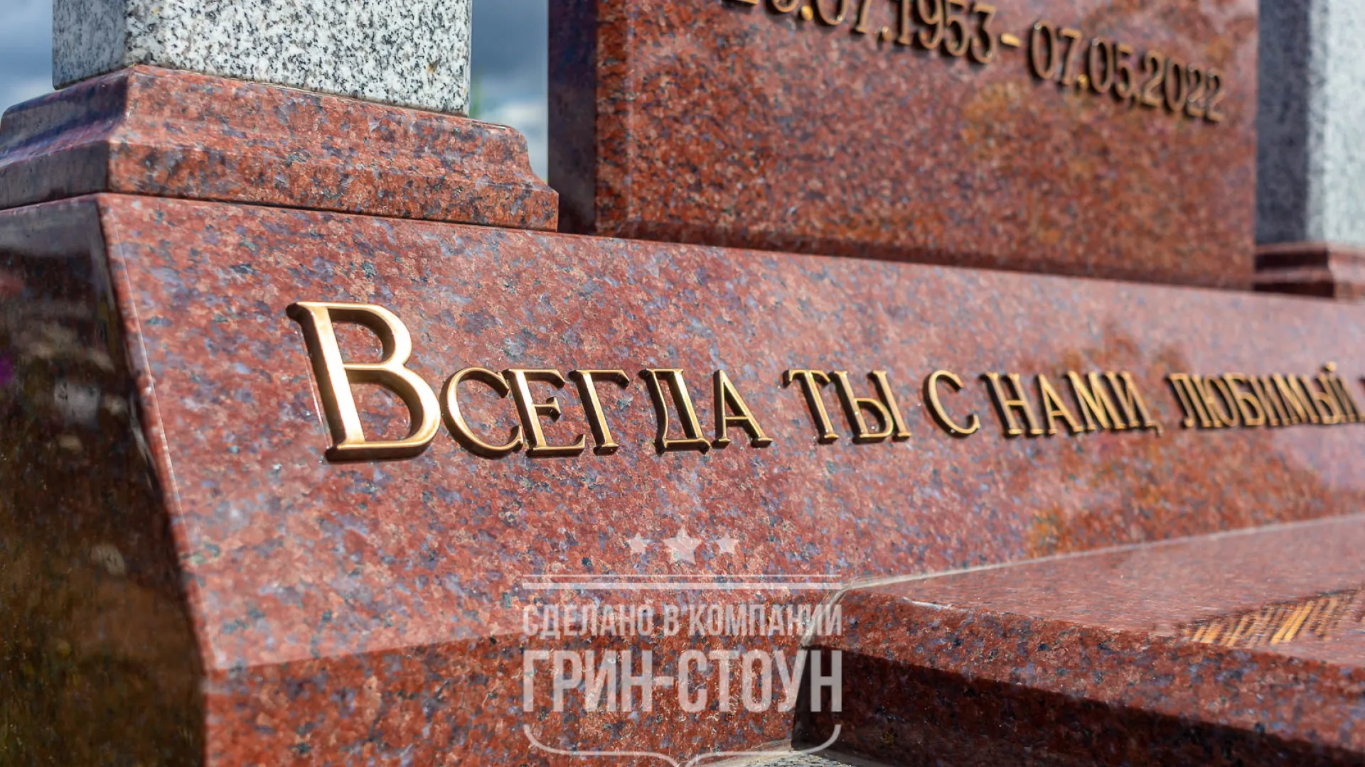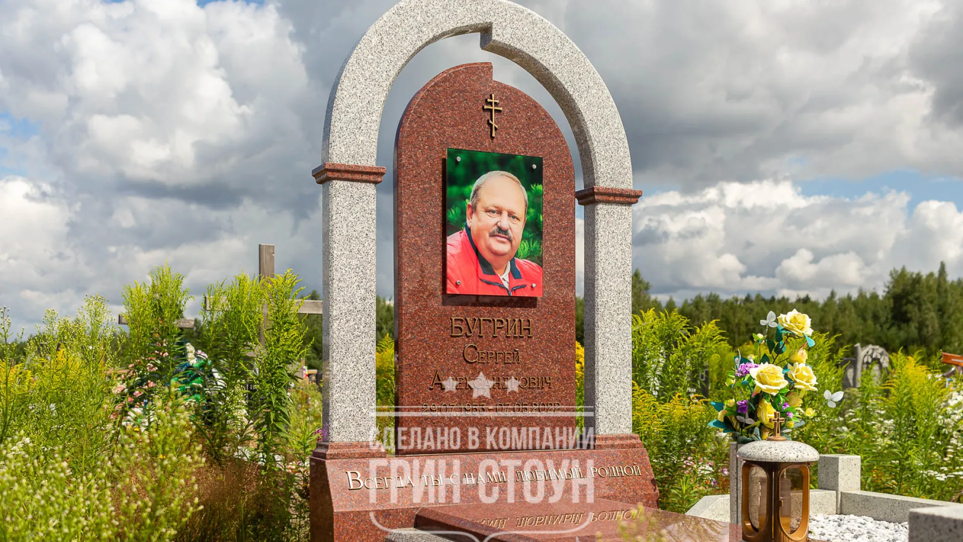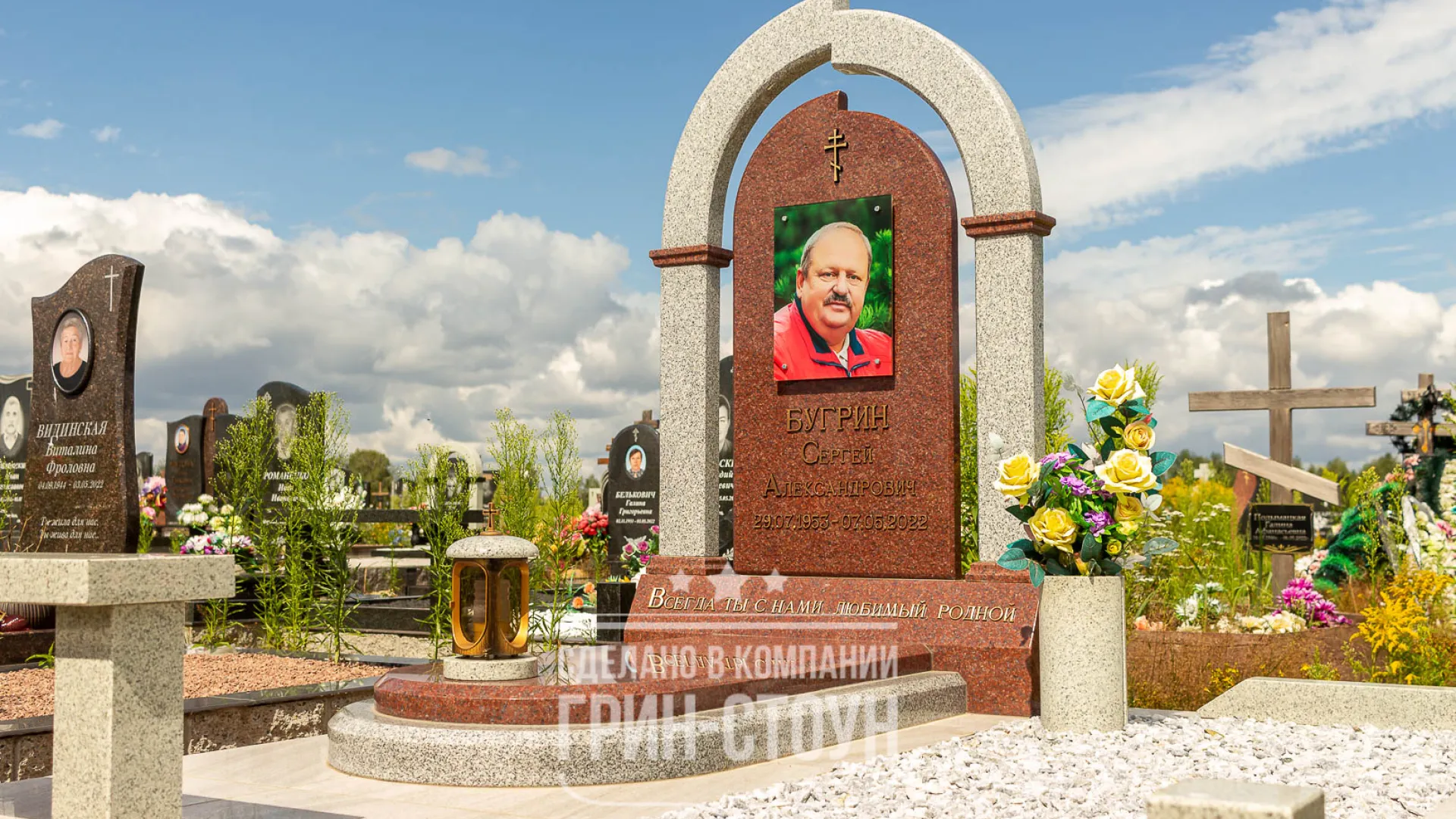 Памятник изготовлен из индийского гранита Imperial Red и китайского G-603. Форма арки традиционна для мемориальных комплексов, но эта модель памятника разработана нашим дизайнером в современном стиле, потому комплекс выглядит стильно и ярко. Большое значение в оформлении памятника играет оформление. Портрет выполнен в виде большого стеклянного медальона 30*40 на метизах. Такой способ крепления очень оригинален, кроме того, при желании, медальон легко можно заменить. Оформление текстом - итальянская бронза Caggiatti. Из акусессуров использованы ваза и лампада из Мансуровского гранита.