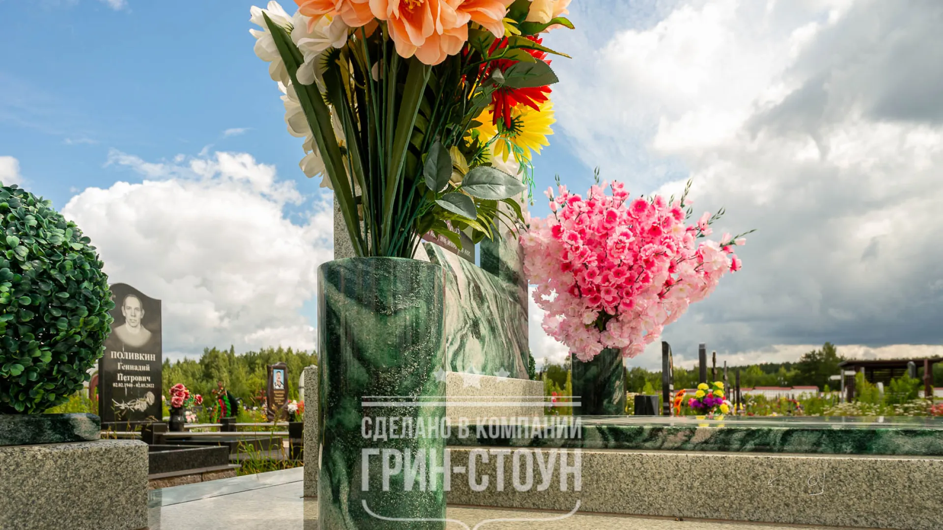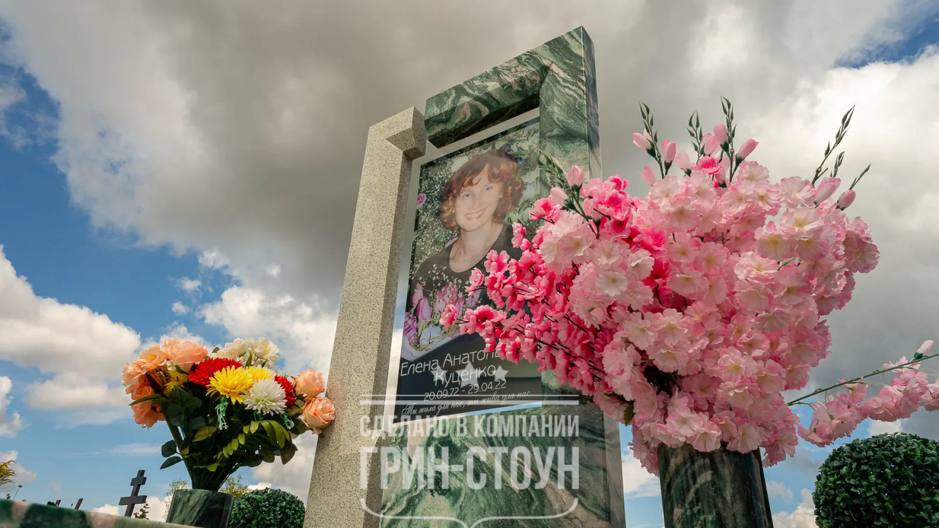 Мемориальный коплекс заказчик устанавливал в память об умершей жене. Главным пожеланием было наличие большого медальона с размещением на нём надписей, других предпочтений не было. Идея комплекса была полностью подготовлена менеджером, проект разработан и подготовлен дизайнером в SolidWorks, инженерной программе. Изначально по материалу был выбран только зелёный кварцит Arctic Green, но после обсуждения и просмотра проекта в комплекс добавили светлый Мансуровский гранит, что визуально облегчило восприятие памятника.