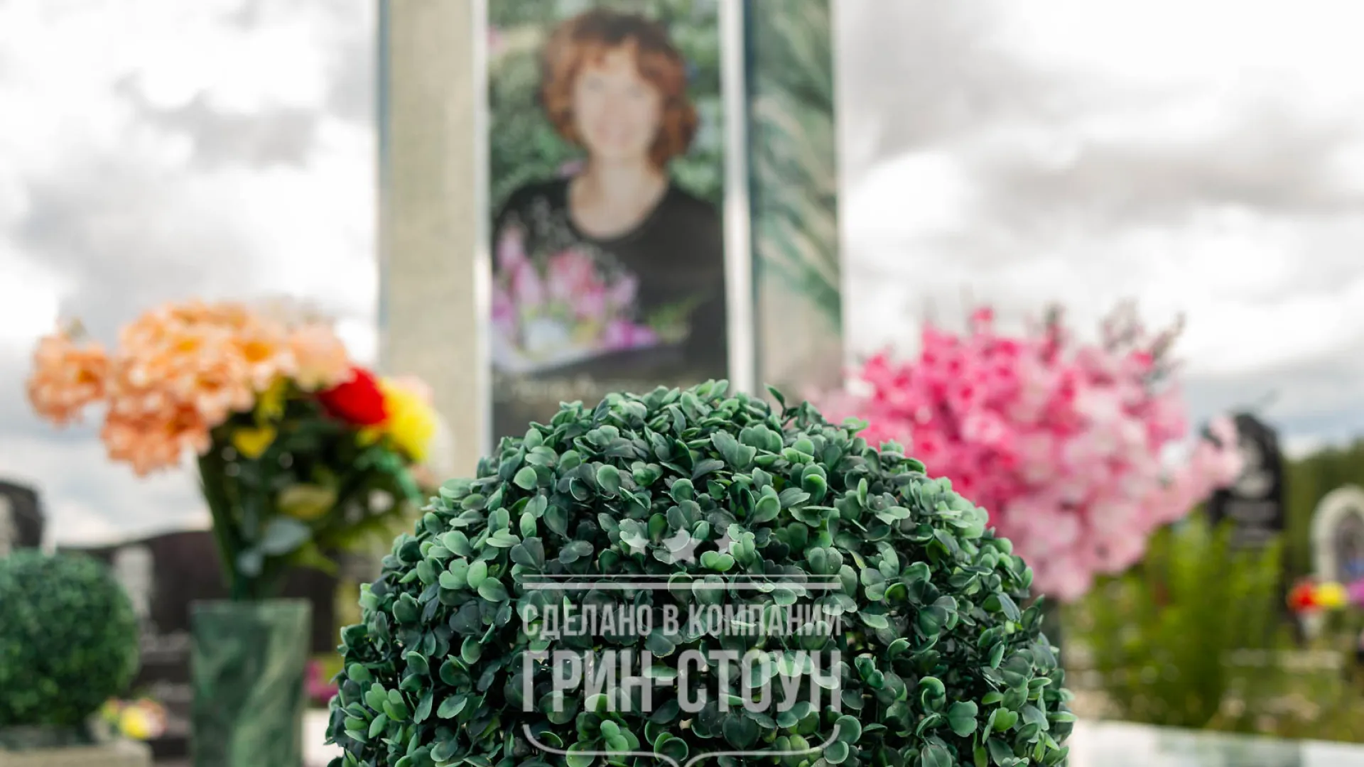 Главный акцент памятника - парящий медальон, для создания этого эффекта по краям изображения оставлено неокрашенное стекло, а сам медальон закреплён с помощью 6 метизов на обратной стороне камня. Все надписи размещены под изображением, на этом же стеклянном триплексном медальоне. Особое внимание стоит обратить на нестандартное решение оформления периметра участка. Ограды на захоронении нет, эту роль выполняют искусственные самшиты на гранитных подставках. Такое изящное решение создало особую атмосферу лёгкости, гармонично дополняя яркий цвет кварцита и парящий в камне медальон. Самшиты надёжно закреплены в гранит стержнями из арматуры.