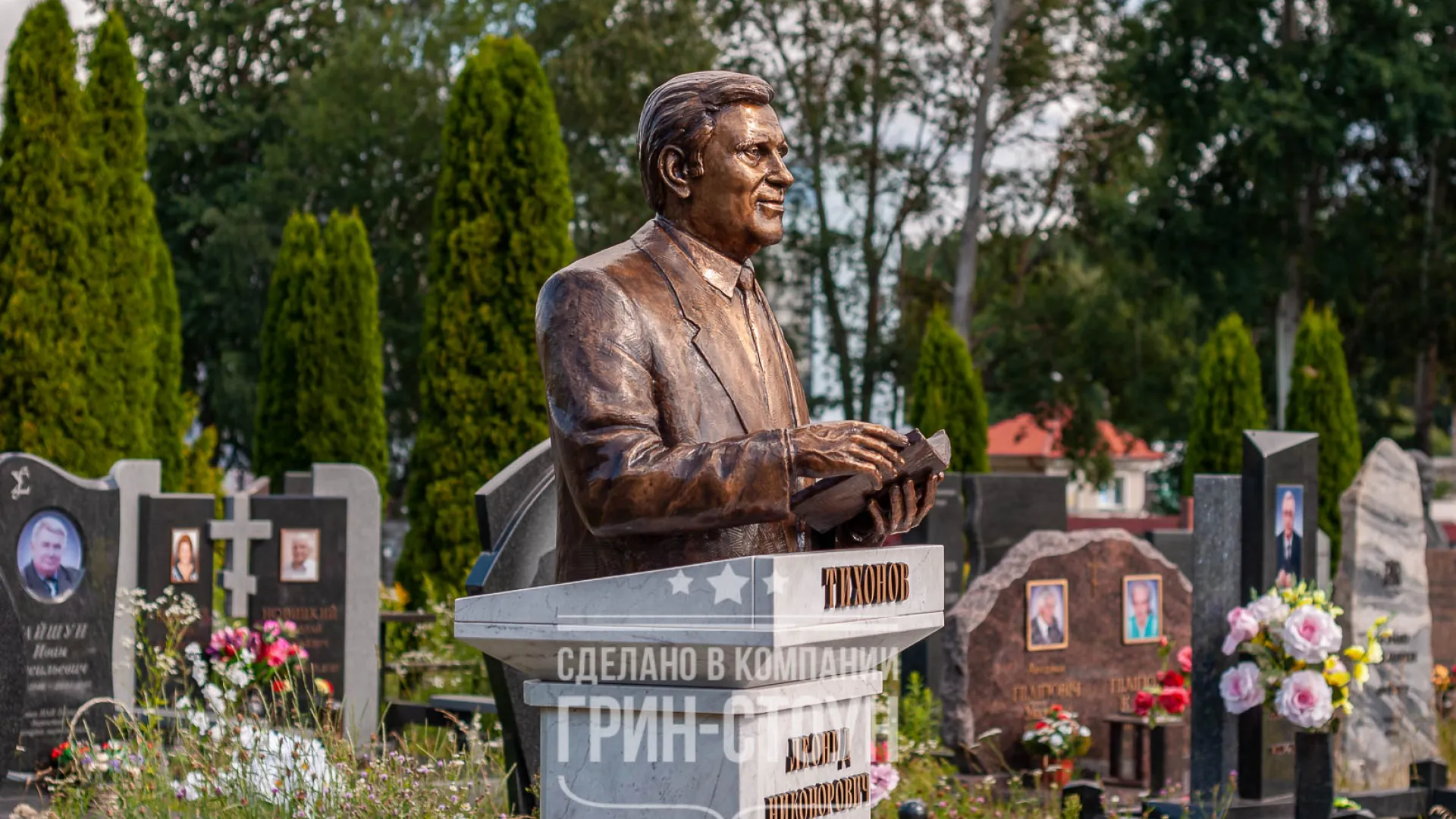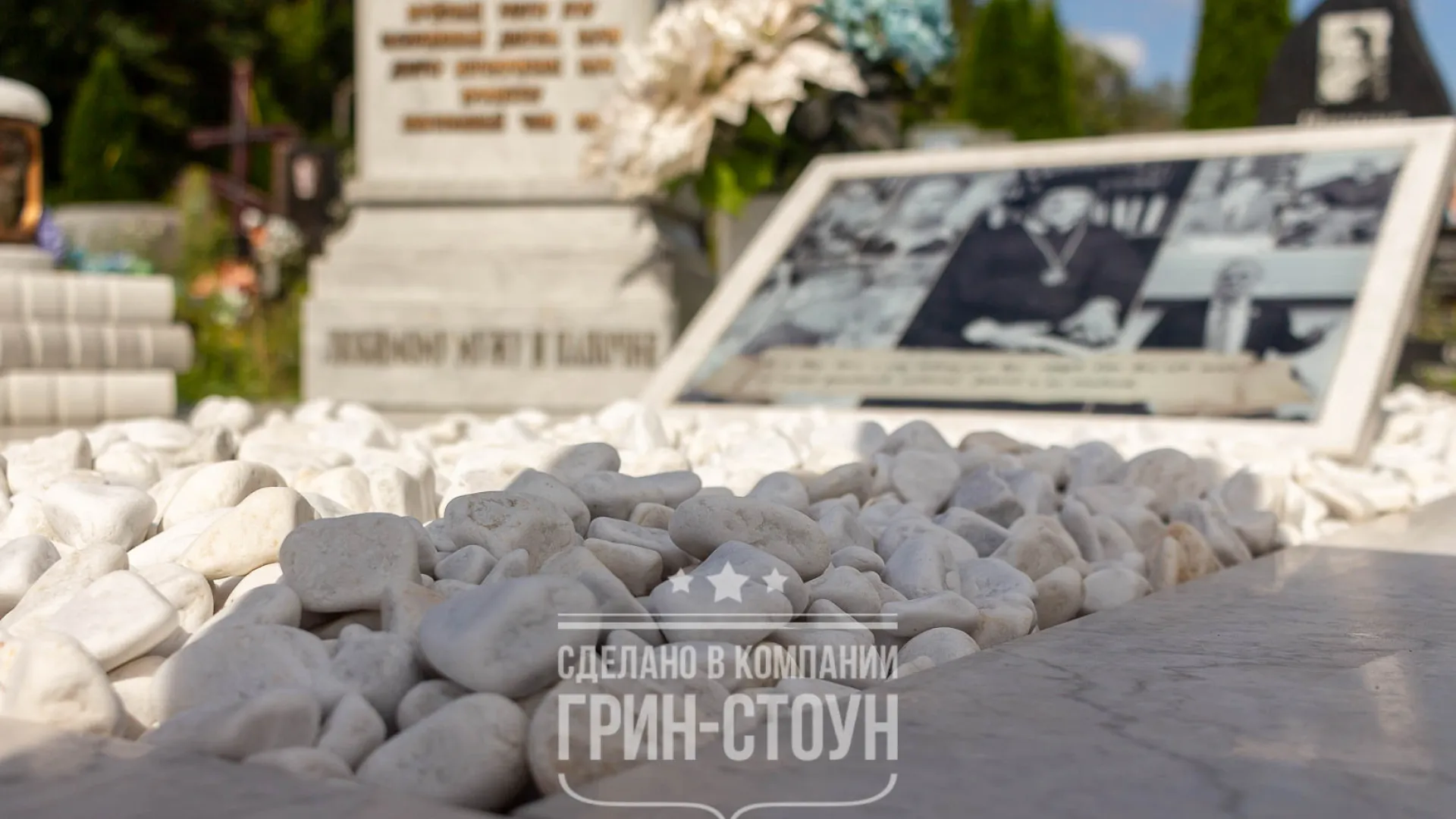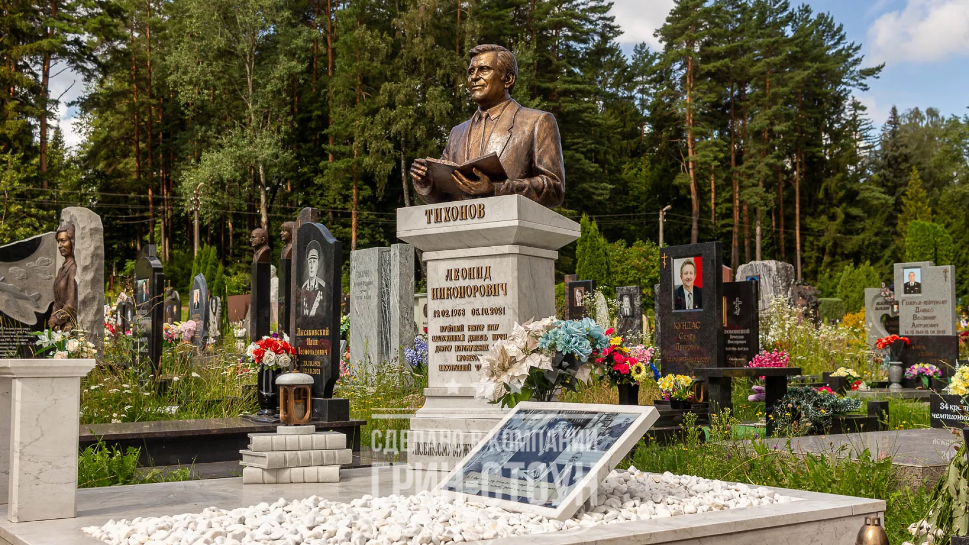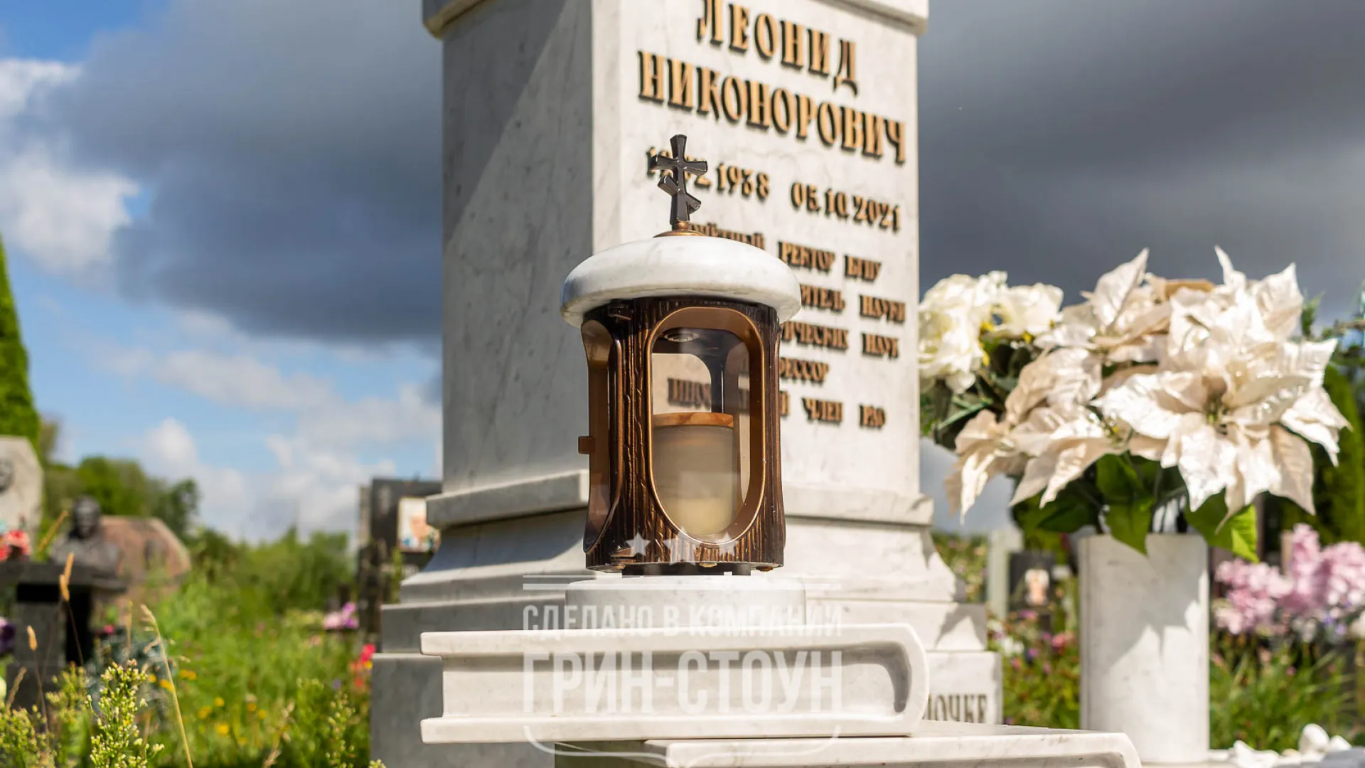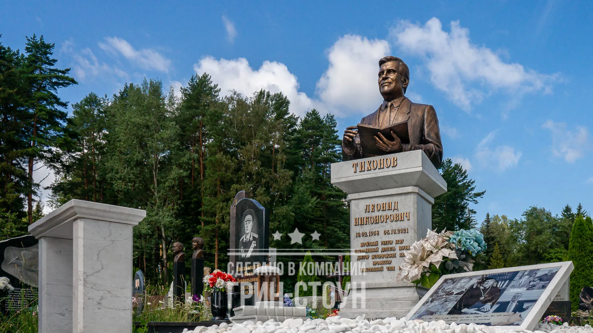 Специально для заказа мы сделали поставку итальянского мрамора Carrara, это один из самых известных мраморов в мире. Рез элементов мы, в целях экономии, заказали у наших партнёров в Китае, в Беларуси такая работа обошлась бы существенно дороже, хотя это тоже возможно, мы используем для таких заказов фрезерный 3d станок. Рядом с памятником мы расположили коллаж на плите из мрамора, на большом стеклянном медальоне запечатлены самые тёплые и значимые моменты жизни профессора и семьянина Леонида Никоноровича. На участке мы расположили скамью со сложным фигурным резом, возле памятника художественно и символично размещена стопка из книг.