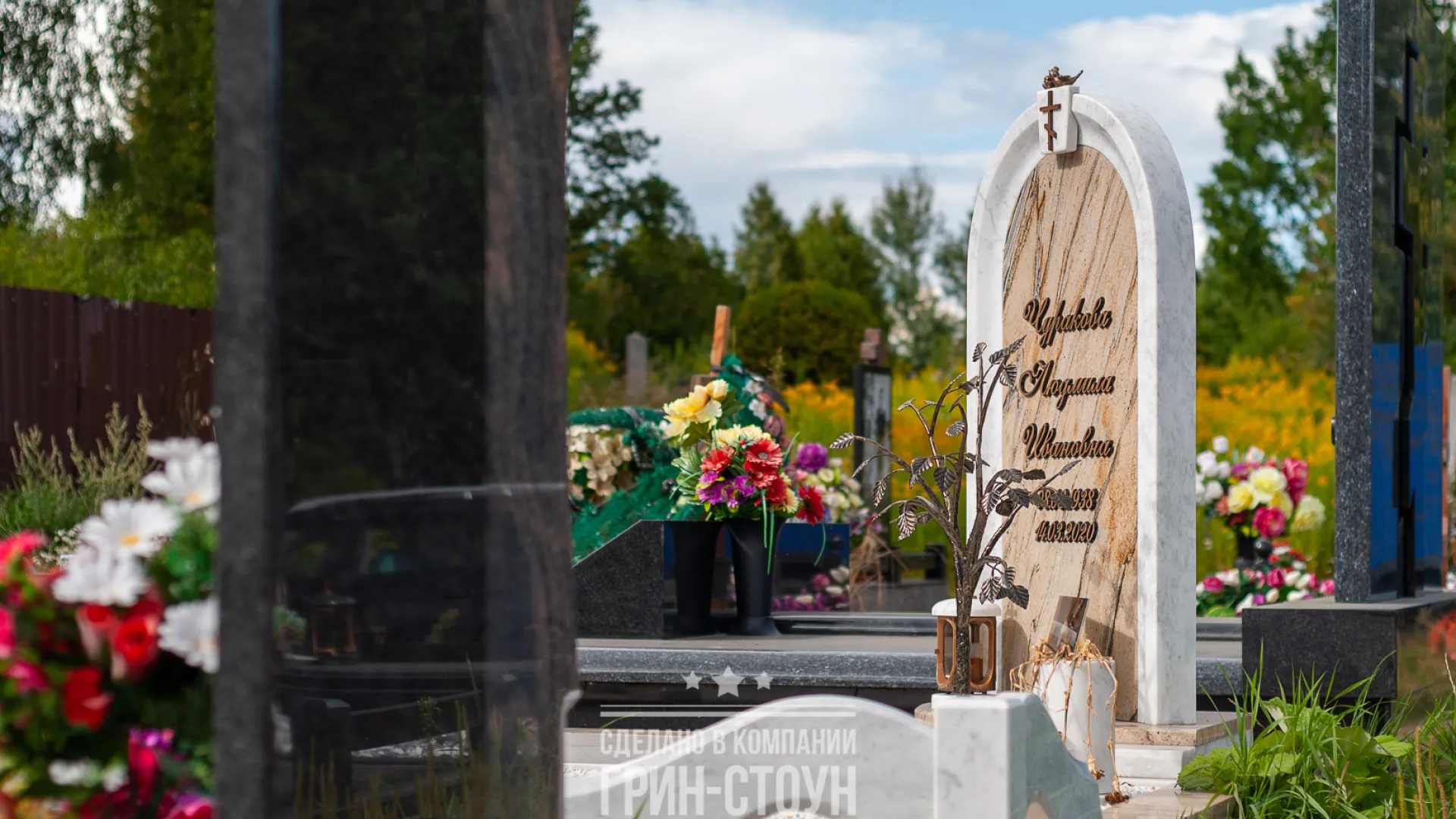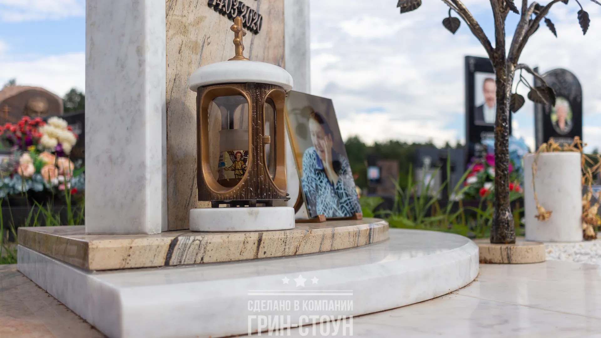 По участку лежит мраморная и гранитная плитка, из камня выполнена и облицовка фундамента, благодаря чему постамент будет сохранять декоративные характеристики долгие годы.