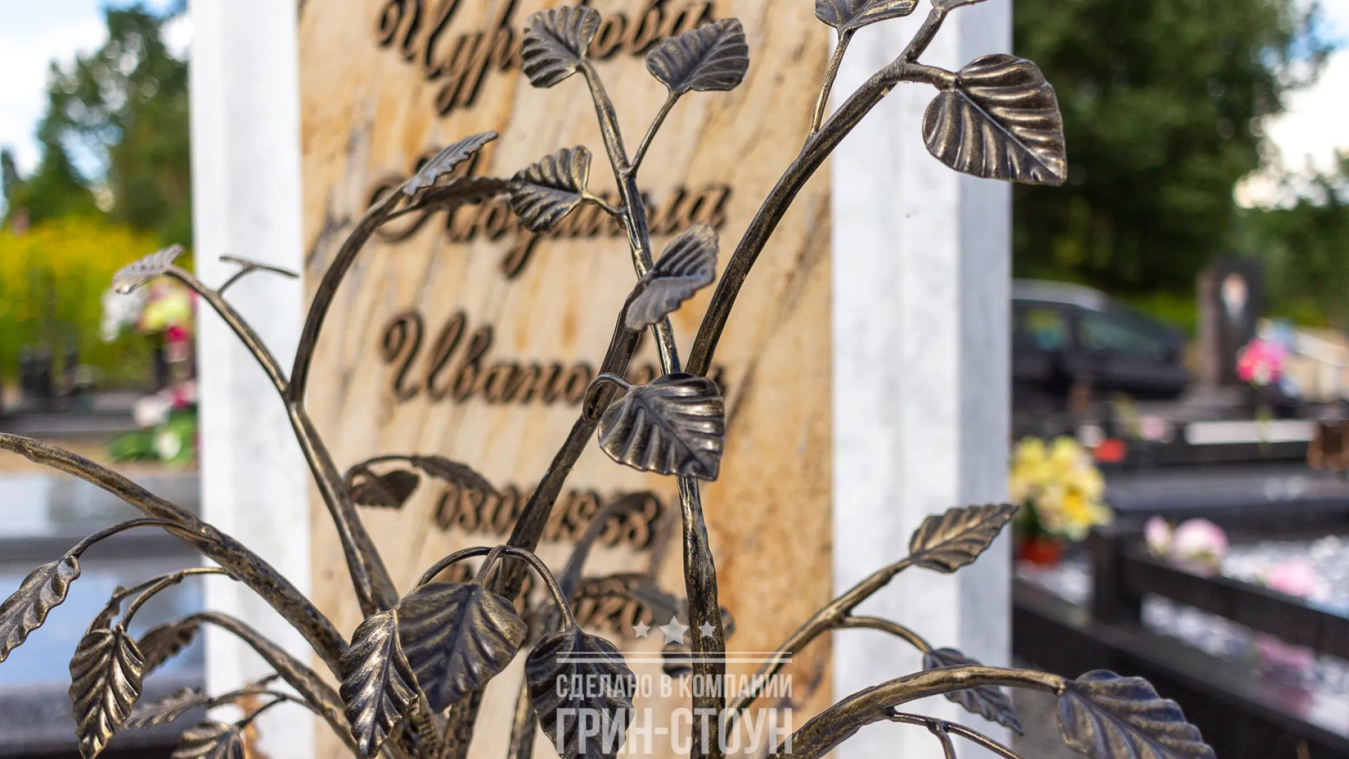 Дерево – символ древа жизни и отражение идеи родового дерева. Элемент надгробия изготовлен из металла методом ковки. По цвету дерево очень похоже на бронзу, но кованные элементы по стоимости выгодно отличаются от аналогичных бронзовых аксессуаров.