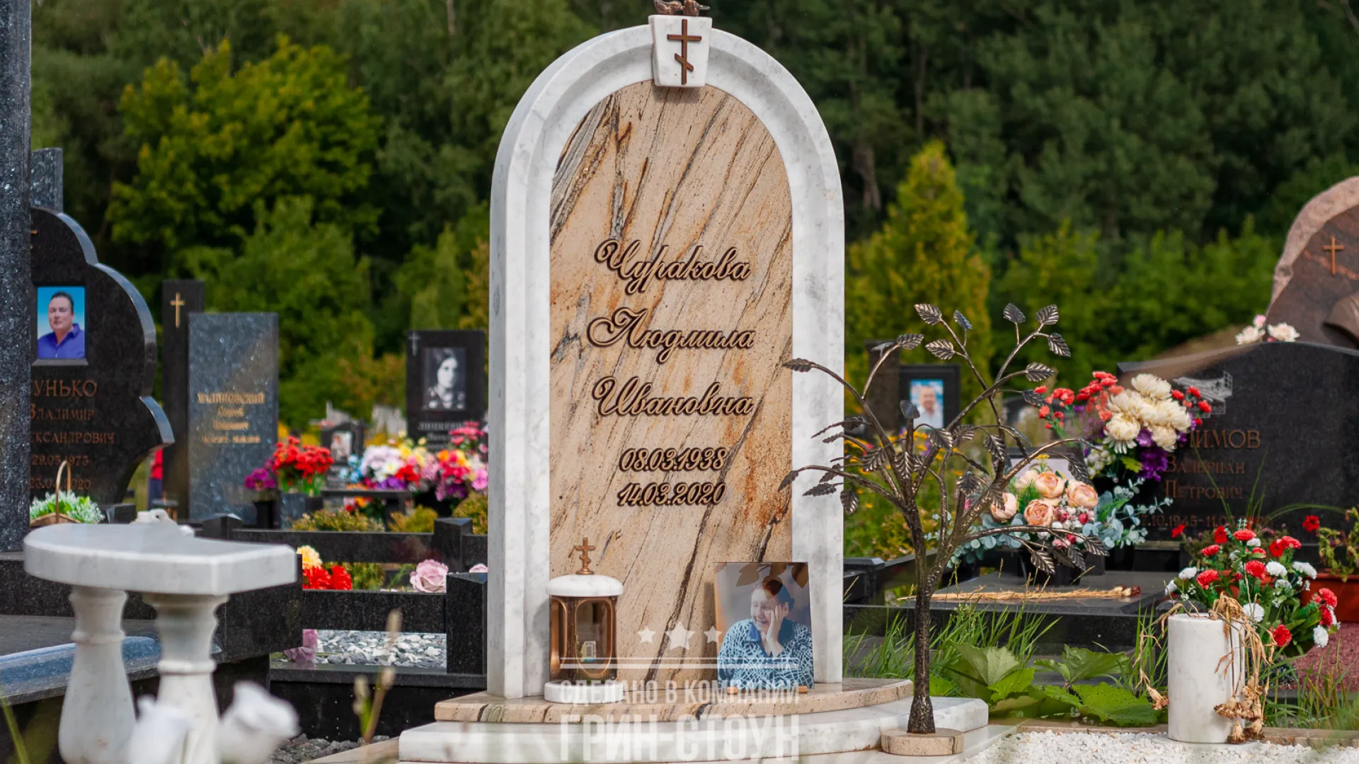 Важный момент в восприятии памятника – материал, из которого он изготовлен. Совместно с заказчиком был выбран гранит Prada Gold (Индия) и мрамор Коелга (Россия). Тёплый оттенок гранита Prada отлично подходит для воплощения женского образа, при этом структура гранита очень декоративная. Белый мрамор оттеняет выразительность цветного гранита, оставляя ощущение лёгкости.