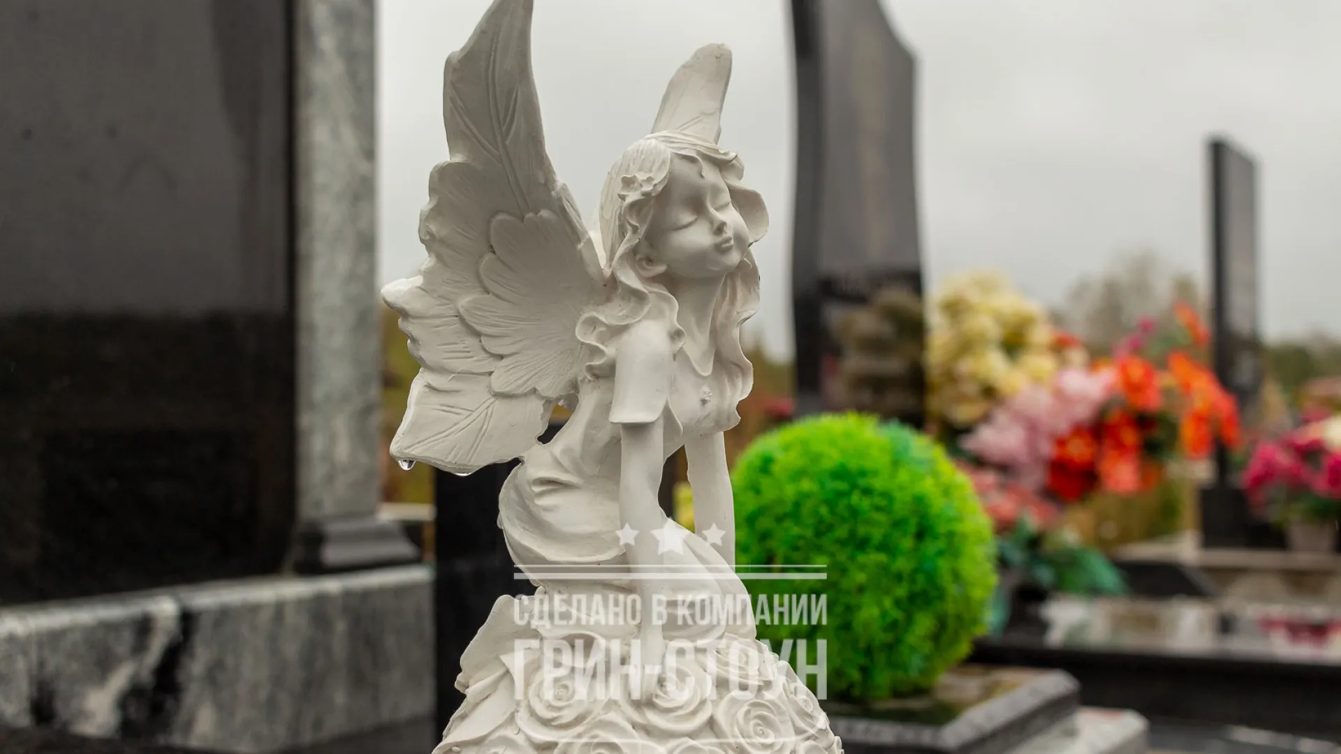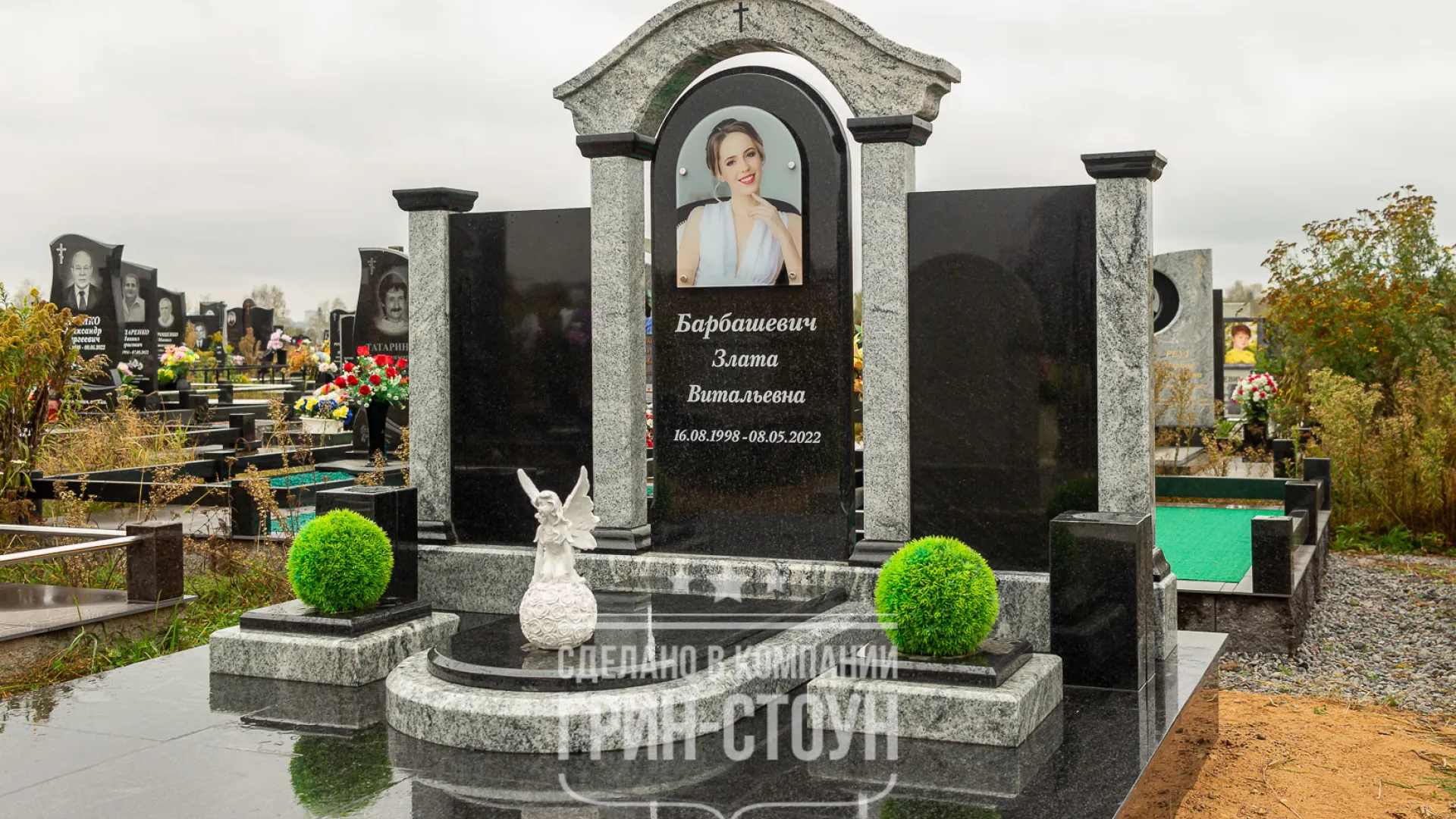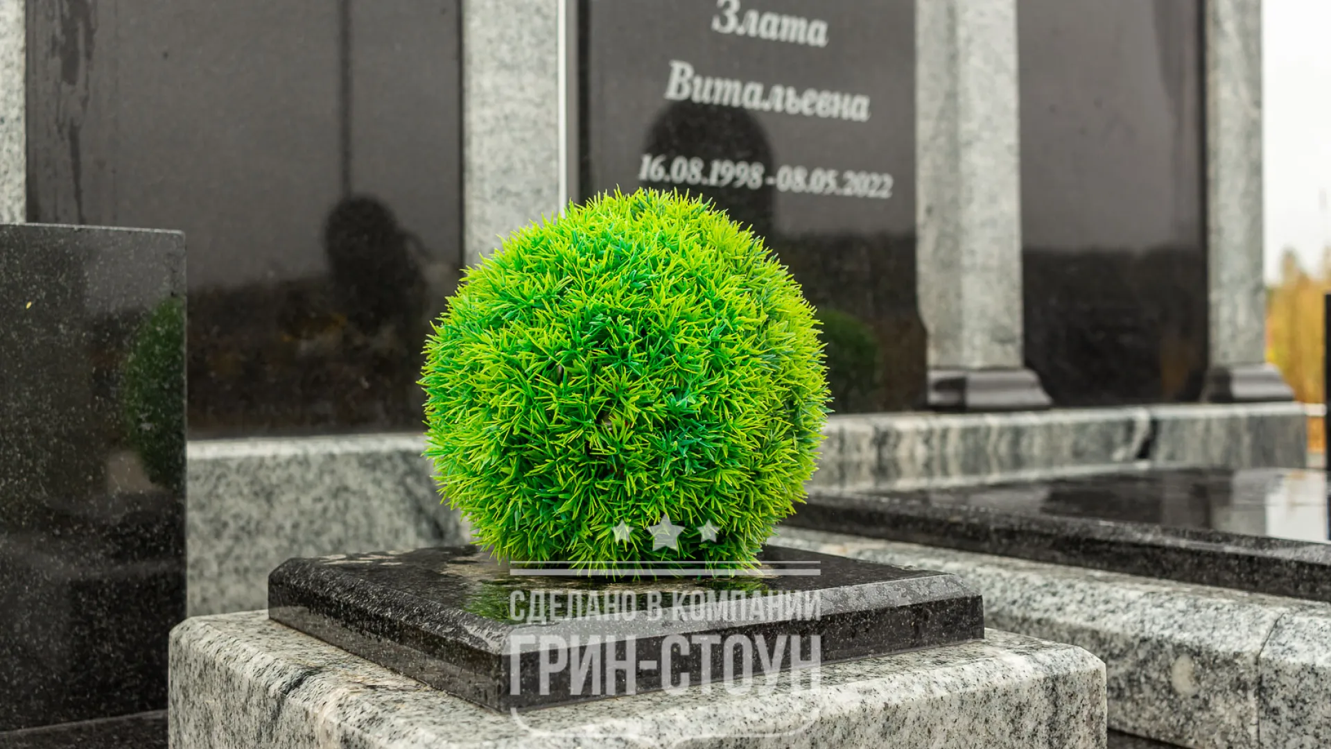 В качестве аксессуаров комплекс дополнен разрезными гранитными вазами и полимерной скульптурой ангела. Искусственные самшиты - яркие цветовые акценты в стильном дизайне мемориала. Конструкция крепления самшитов предполагает возможность их замены при необходимости.
