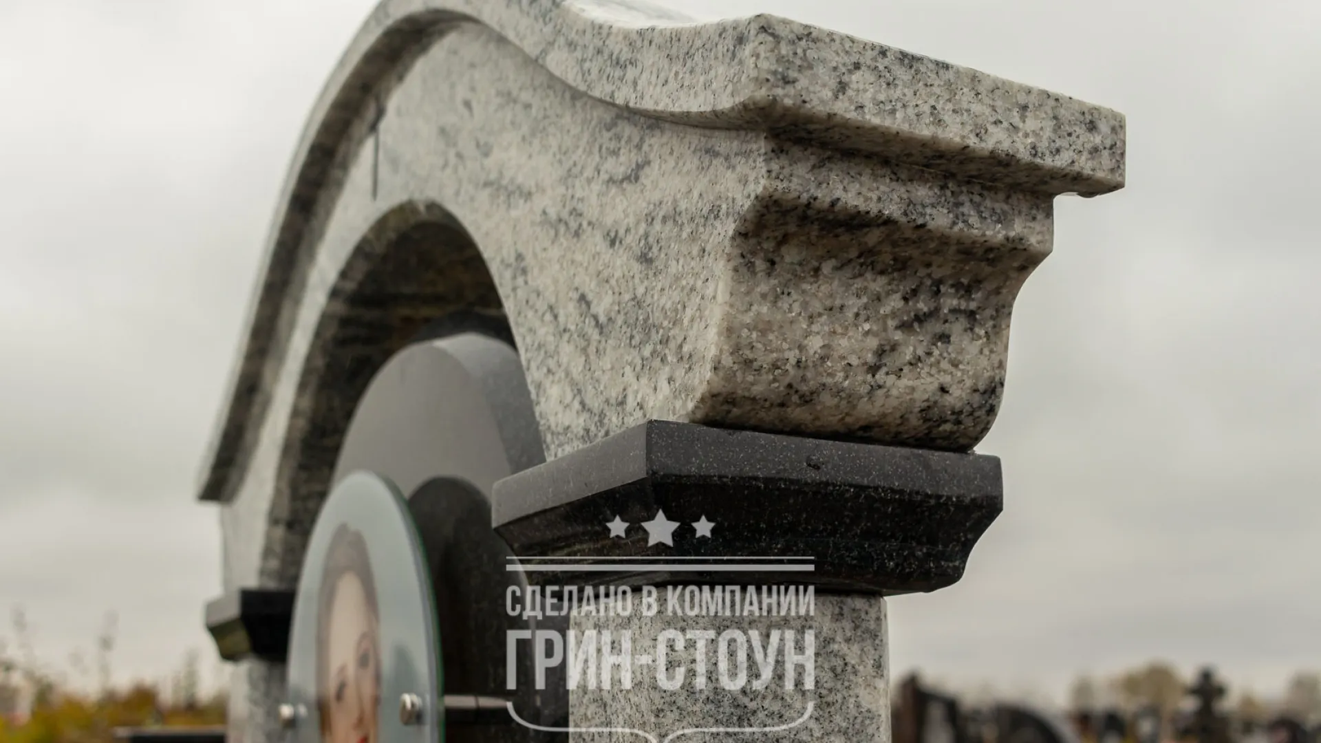 Мемориальный комплекс изготовлен из российского габбро-диабаза и индийского гранита Viscont White. Индийский камень Viscont - один из самый светлых гранитов, отличающийся очень высокой плотностью, не требующий использования уходовых средств в процессе эксплуатации. Портрет выполнен в виде стеклянного медальона на метизах, текст - гравированные буквы с покрытием белой краской. Обратите внимание, что вся поверхность и торцевая часть фундамента закрыта гранитом. Этот способ благоустройства самый практичный и, безусловно, лучший с позиции эстетики. Памятник с основанием выглядит полноценным мемориальным комплексом, в единой цветовой гамме, из одного материала.
