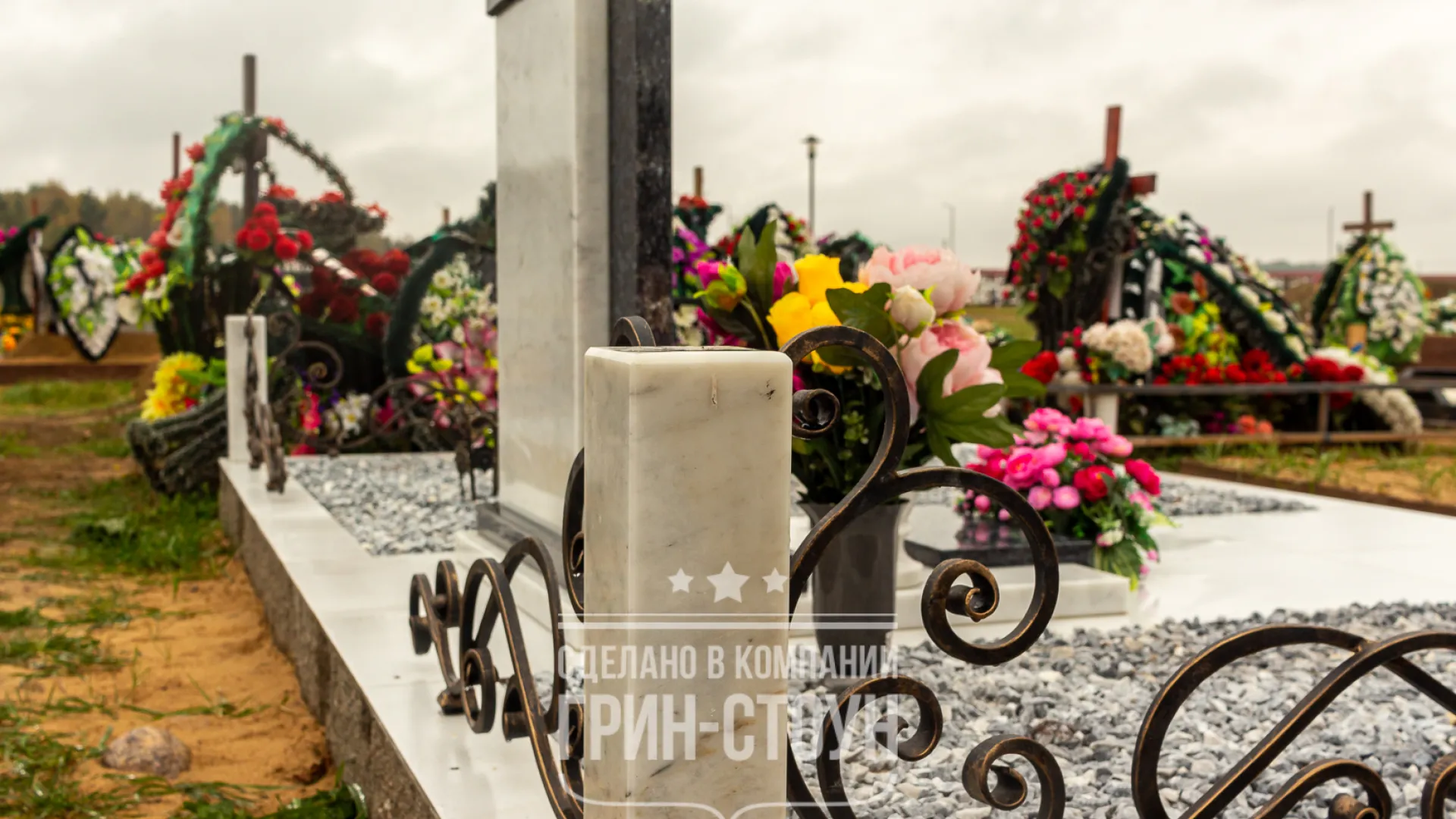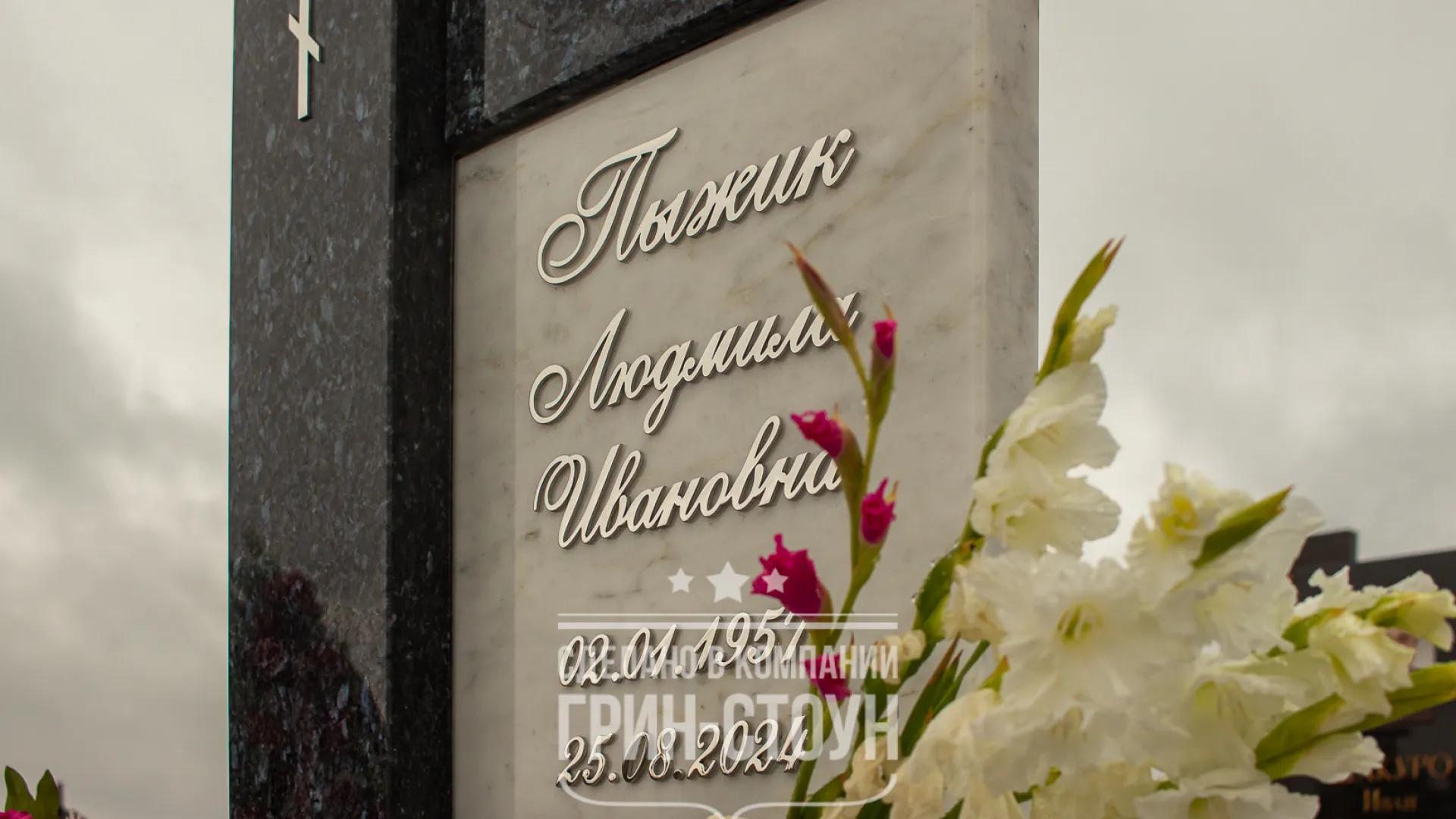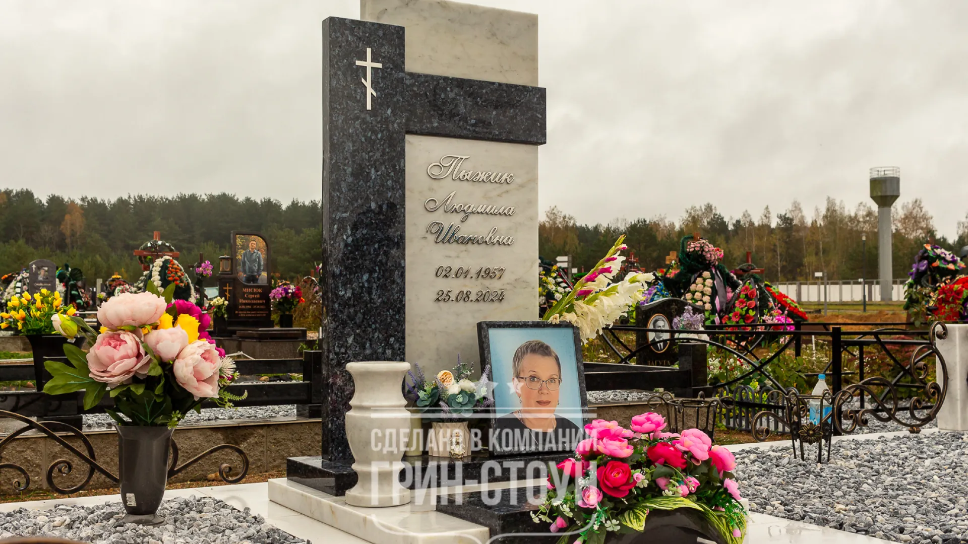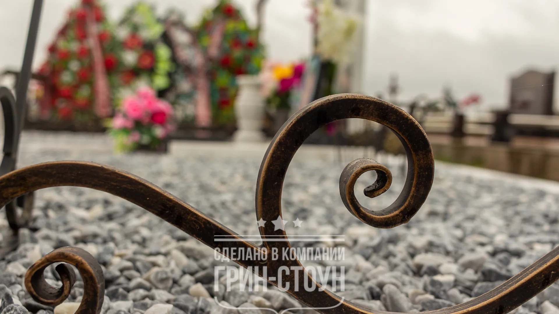 Памятник оформлен медальоном из обжигового стекла в гранитной рамке и буквами из нержавеющей стали. Такой способ оформления очень практичен: керамические красители устойчивы к ультрафиолету, а нержавеющие буквы не требуют подкраски и сохранят привлекательный внешний вид долгие годы. Кованая ограда аккуратно и очень изящно обрамляет периметр захоронения. Ковка периодически нуждается в обработке специальными средствами, но выбор заказчика был мотивирован её высокими декоративными свойствами. В отличие от оград из камня, ковка визуально легче, прозрачнее, этот фактор немаловажен, чтобы подчёркнуть женственность мемориала.