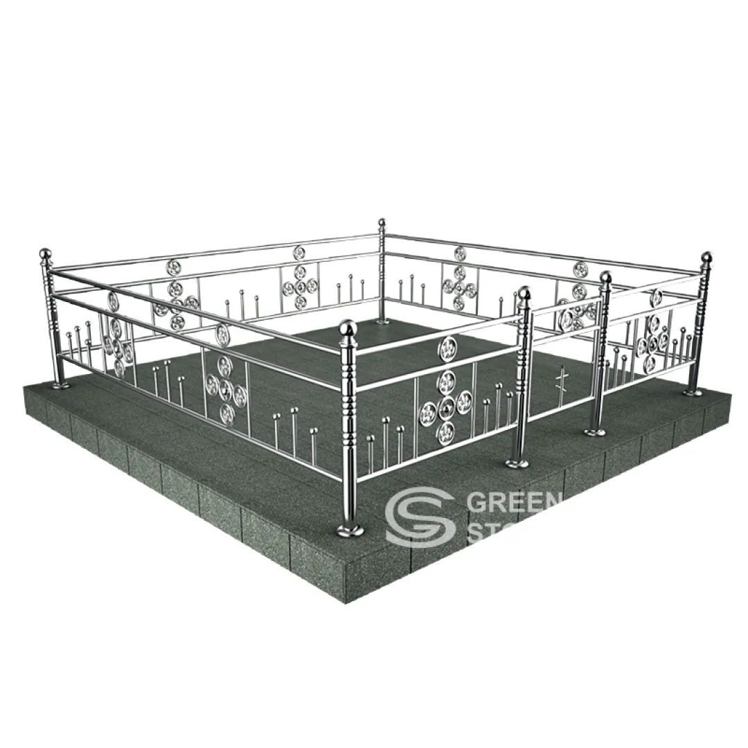 Ограды из нержавейки занимают промежуточную нишу и, пожалуй, являются одним из наиболее сбалансированных и универсальных решений для создания ограждения на участке с захоронением. Вариант ОН-26 высотой 80см. станет прекрасным выбором для оформления композиции любого размера. Нержавейка выглядит нарядно и радикально снижает градус трагизма, украшая даже массивные черные мемориалы.